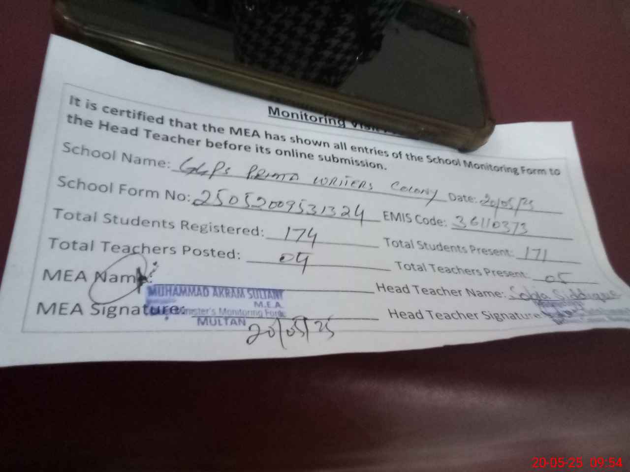 | EMIS Code: 36110373 | Name of School: GGPS MC WRITERS COLONY MULTAN | |||