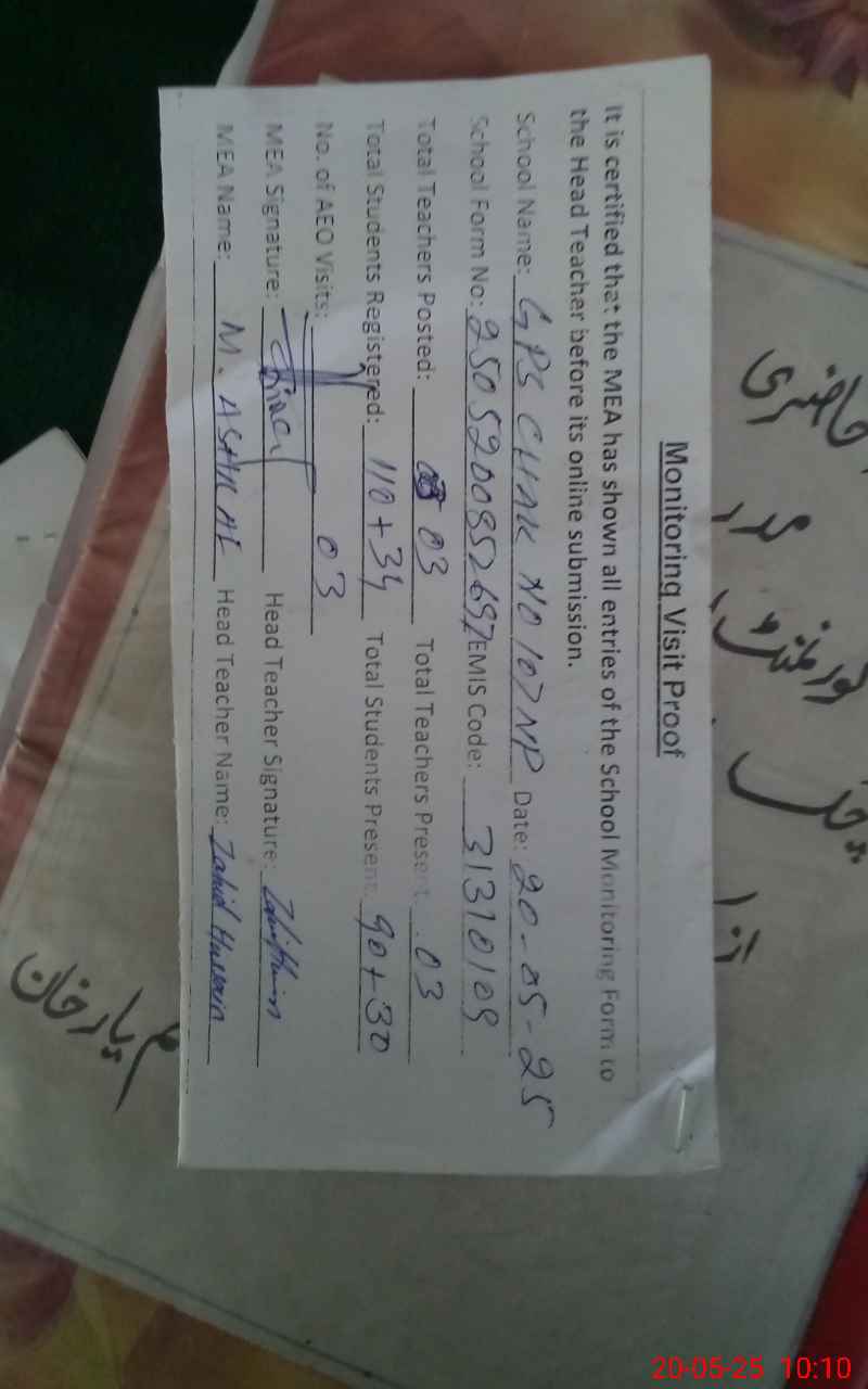 | EMIS Code: 31310109 | Name of School: GPS CHAK NO 107 NP (After Noon) | |||