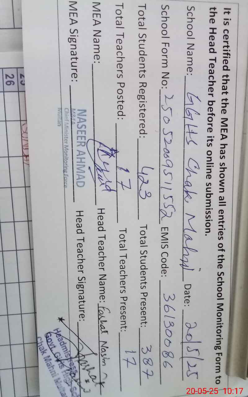 | EMIS Code: 36130086 | Name of School: GGHS CHAK MAHNI NEAR PS UMER PUR | |||