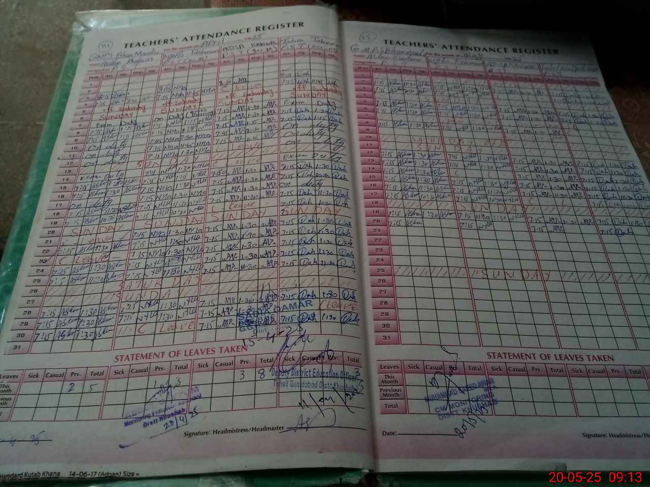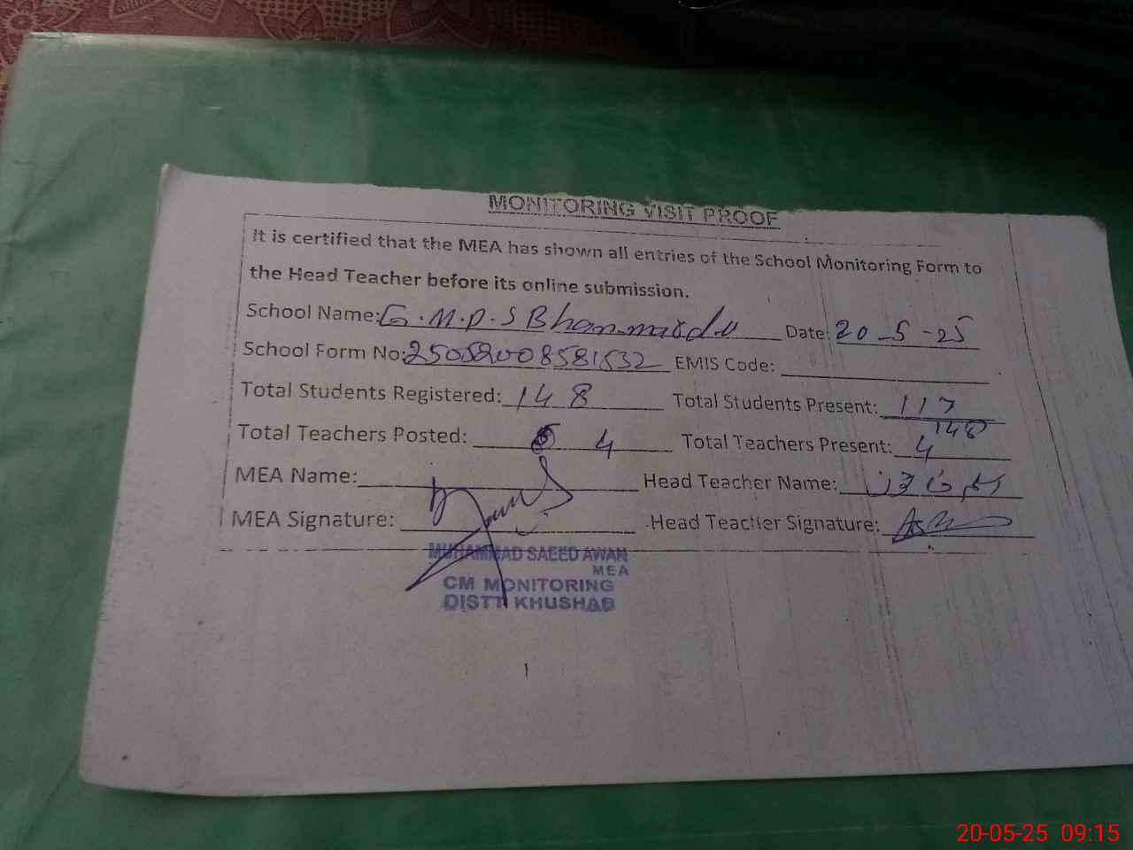| Attendance Register | Head Teacher | MEA with School | Visit Proof |