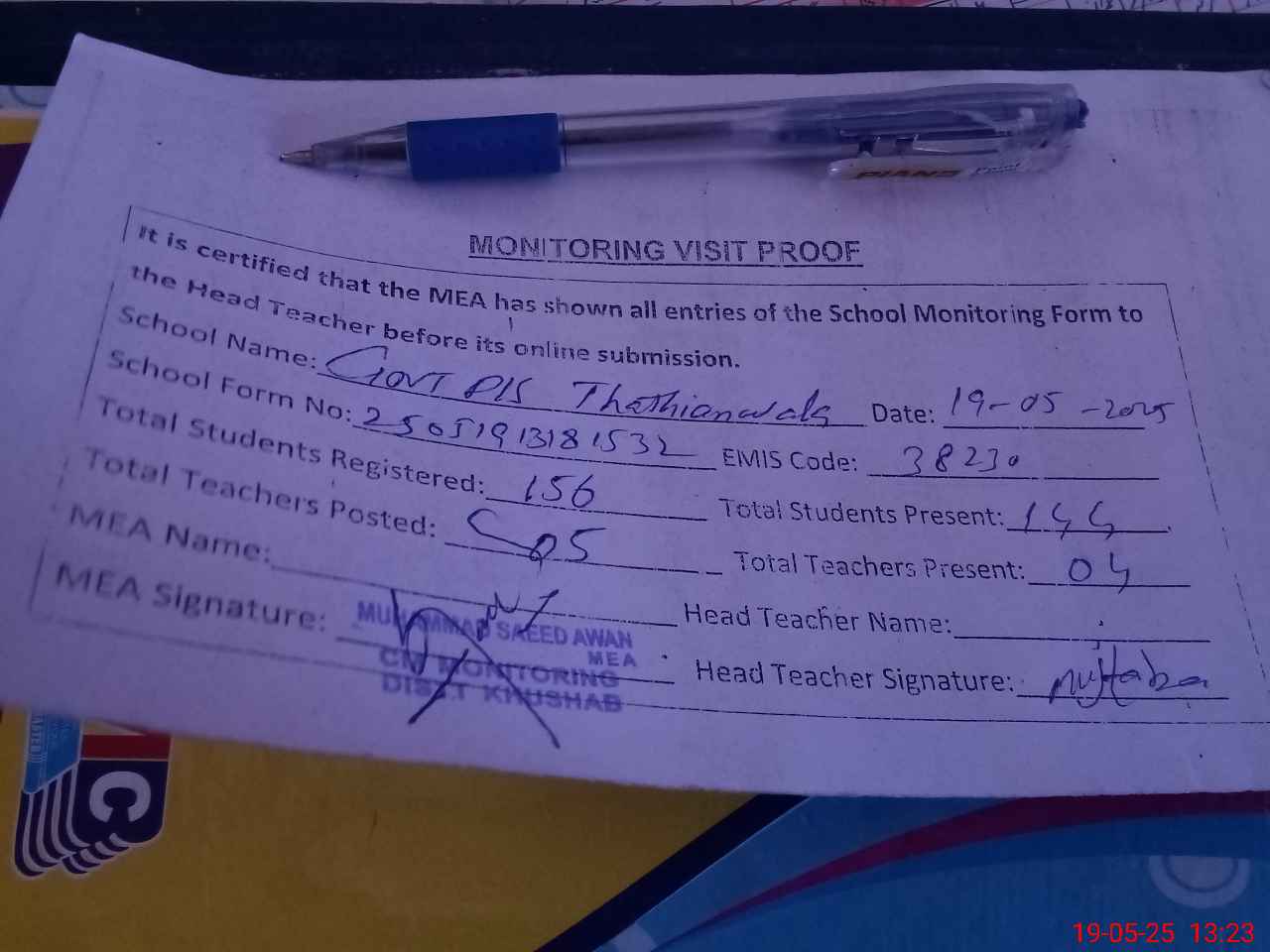 | Attendance Register | Head Teacher | MEA with School | Visit Proof |