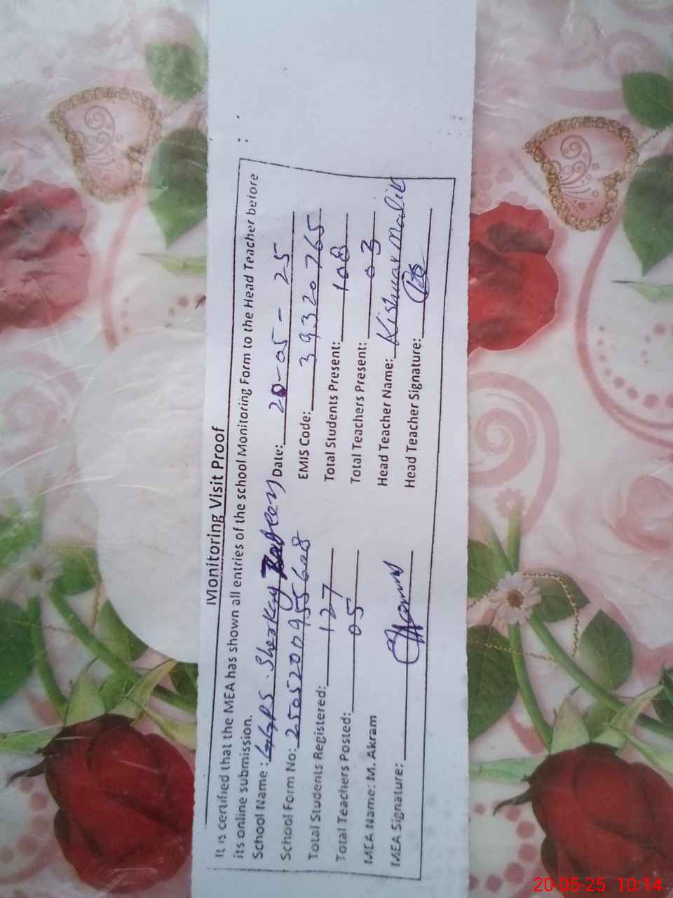 | Attendance Register | Head Teacher | MEA with School | Visit Proof |