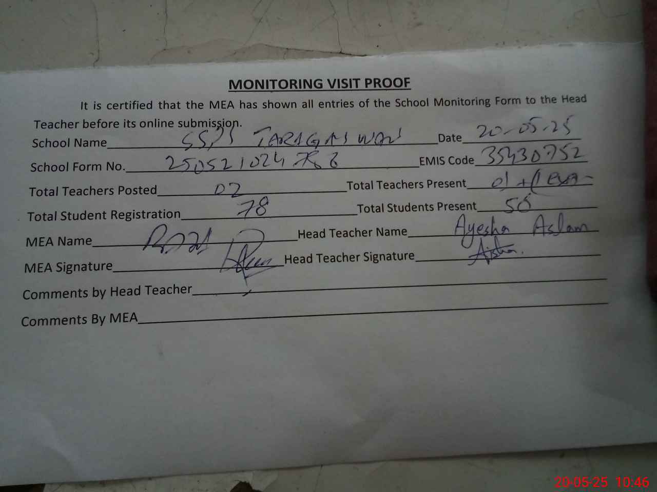 | Attendance Register | Head Teacher | MEA with School | Visit Proof |