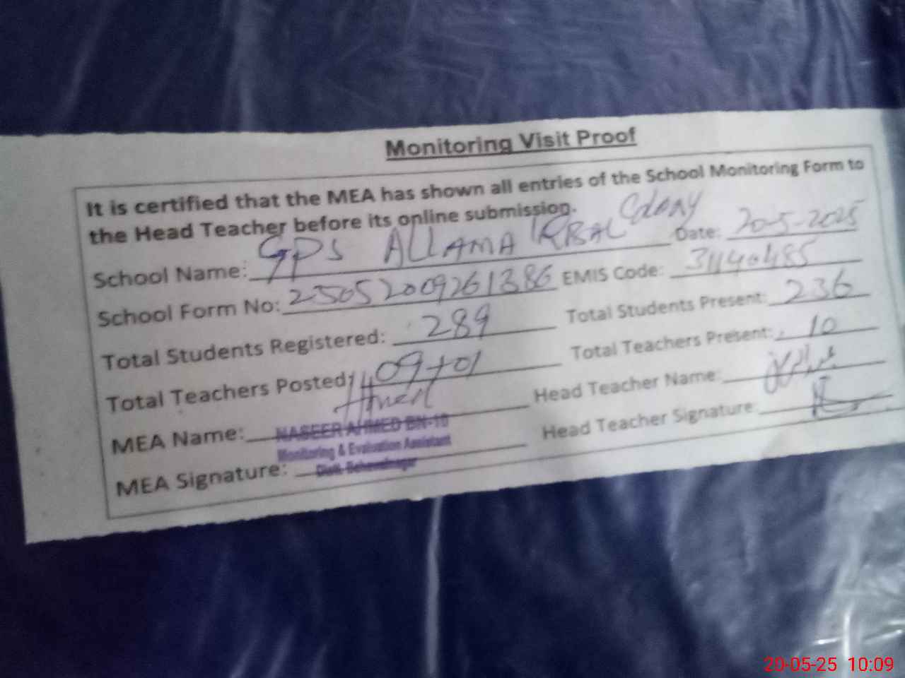 | Attendance Register | Head Teacher | MEA with School | Visit Proof |