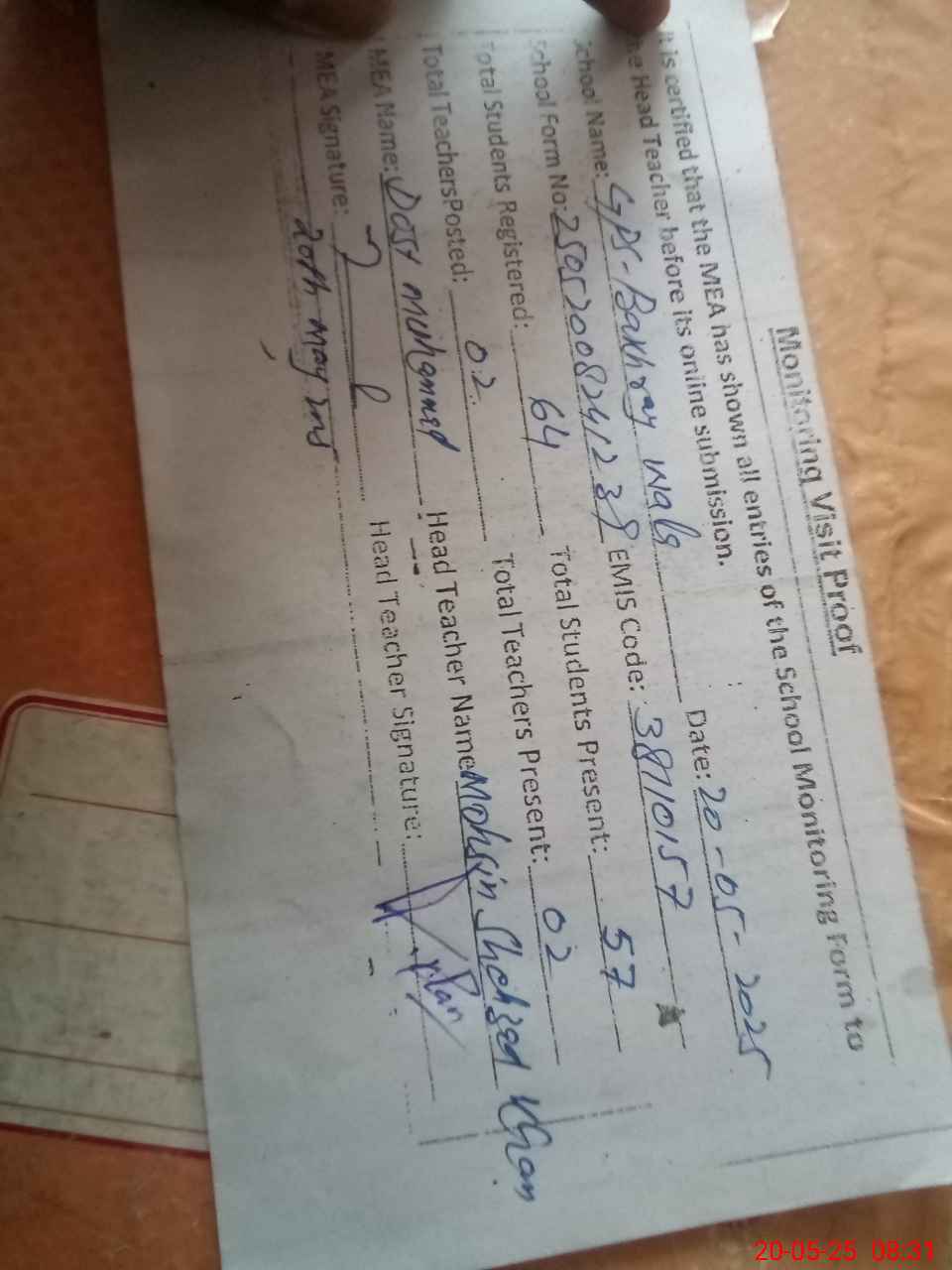 | Attendance Register | Head Teacher | MEA with School | Visit Proof |