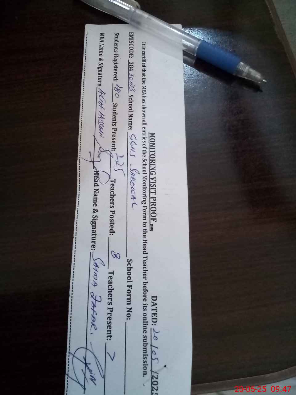 | Attendance Register | Head Teacher | MEA with School | Visit Proof |