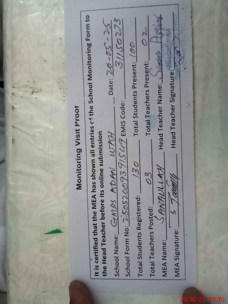 | Attendance Register | Head Teacher | MEA with School | Visit Proof |