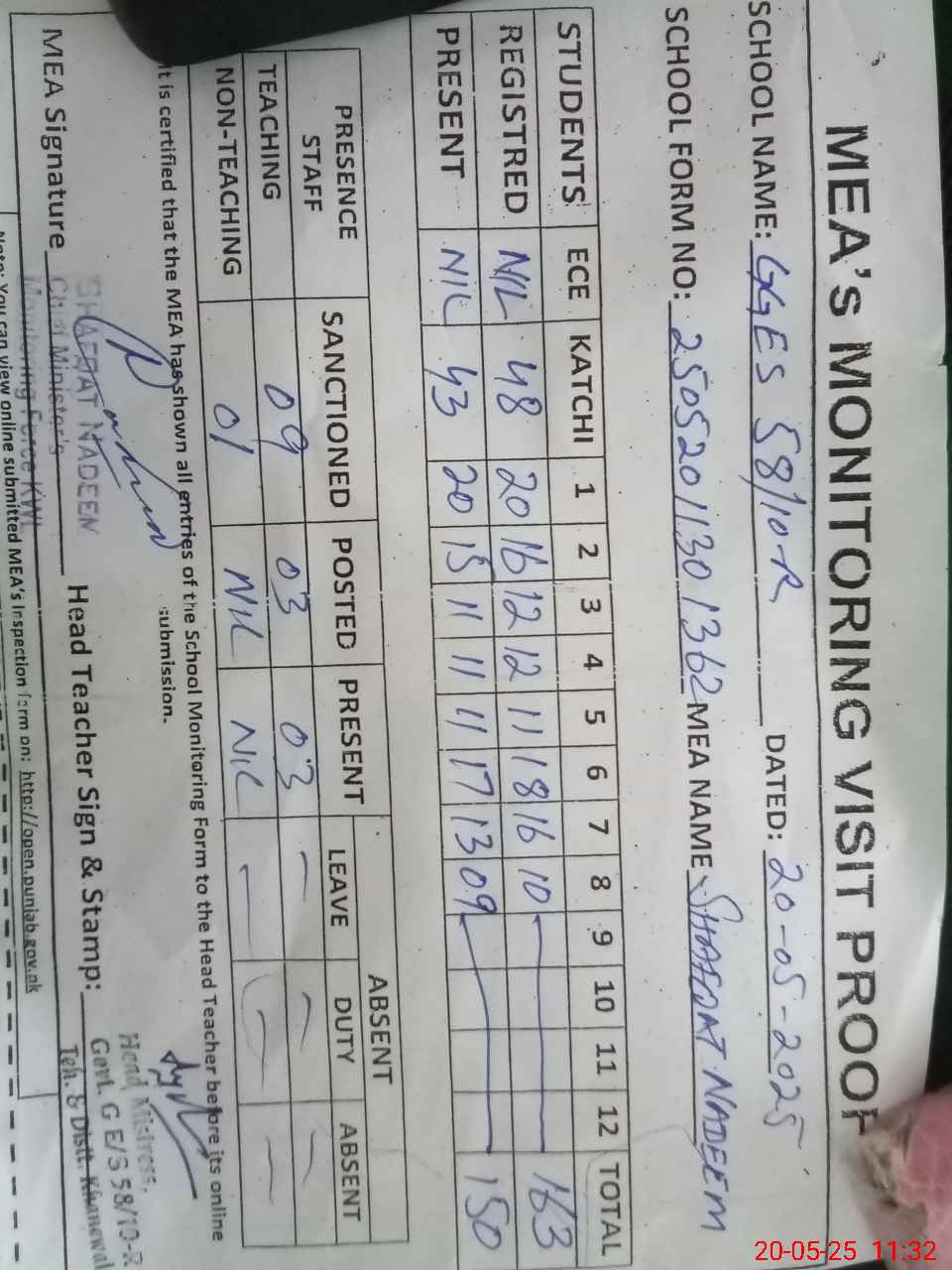 | Attendance Register | Head Teacher | MEA with School | Visit Proof |