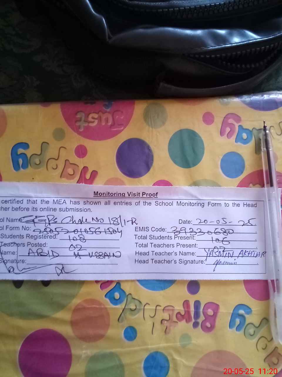 | Attendance Register | Head Teacher | MEA with School | Visit Proof |