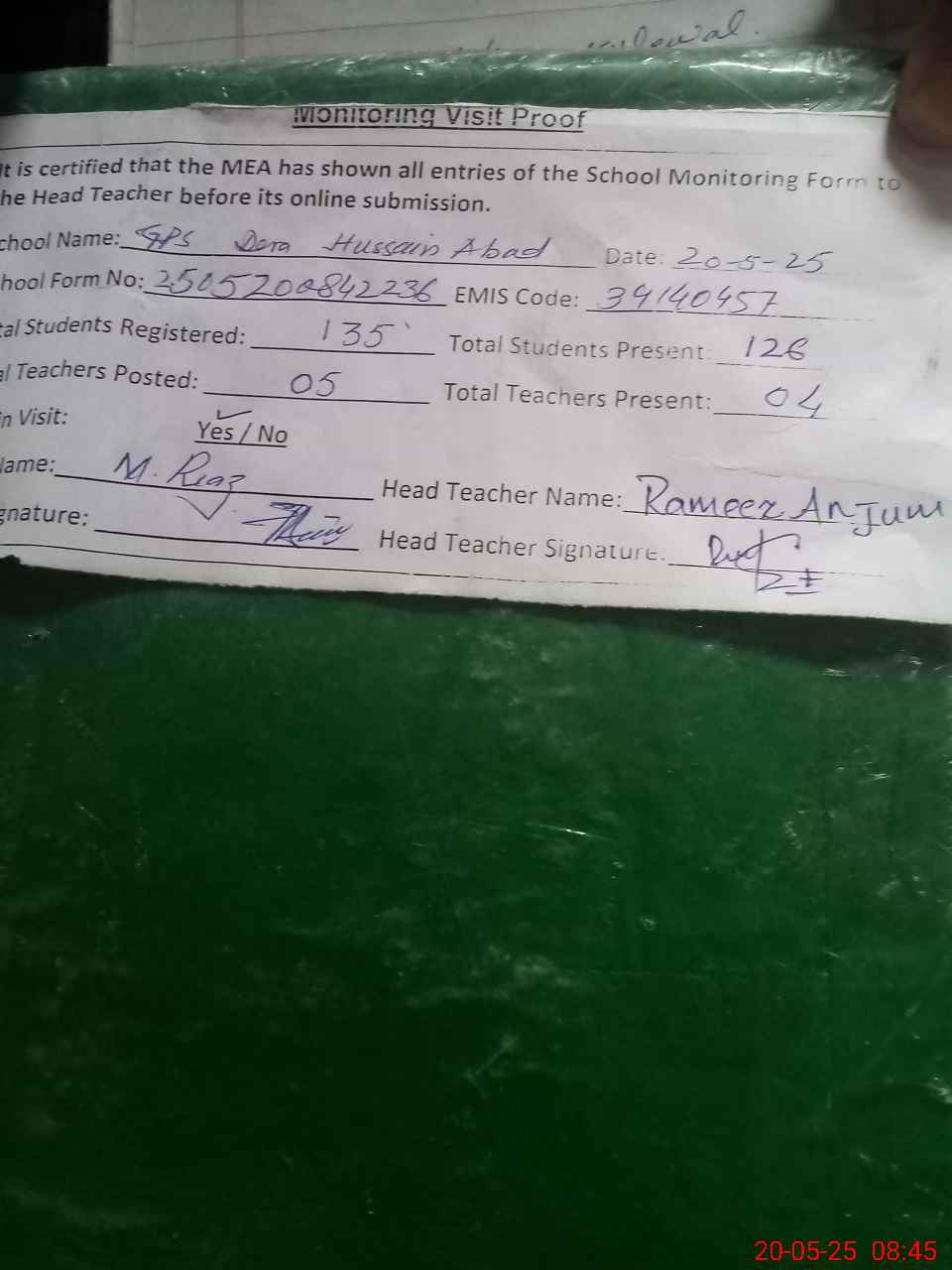 | Attendance Register | Head Teacher | MEA with School | Visit Proof |