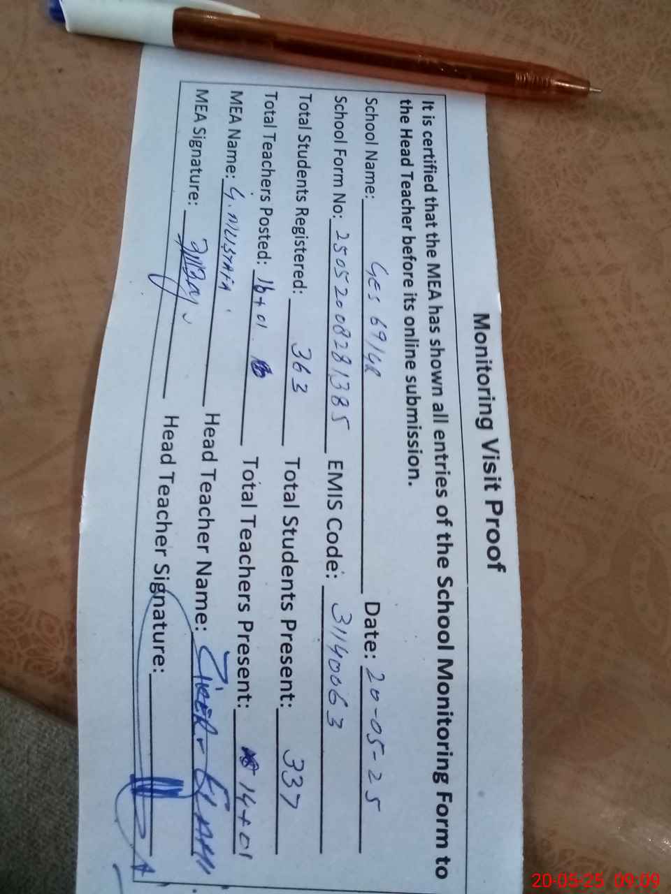 | Attendance Register | Head Teacher | MEA with School | Visit Proof |