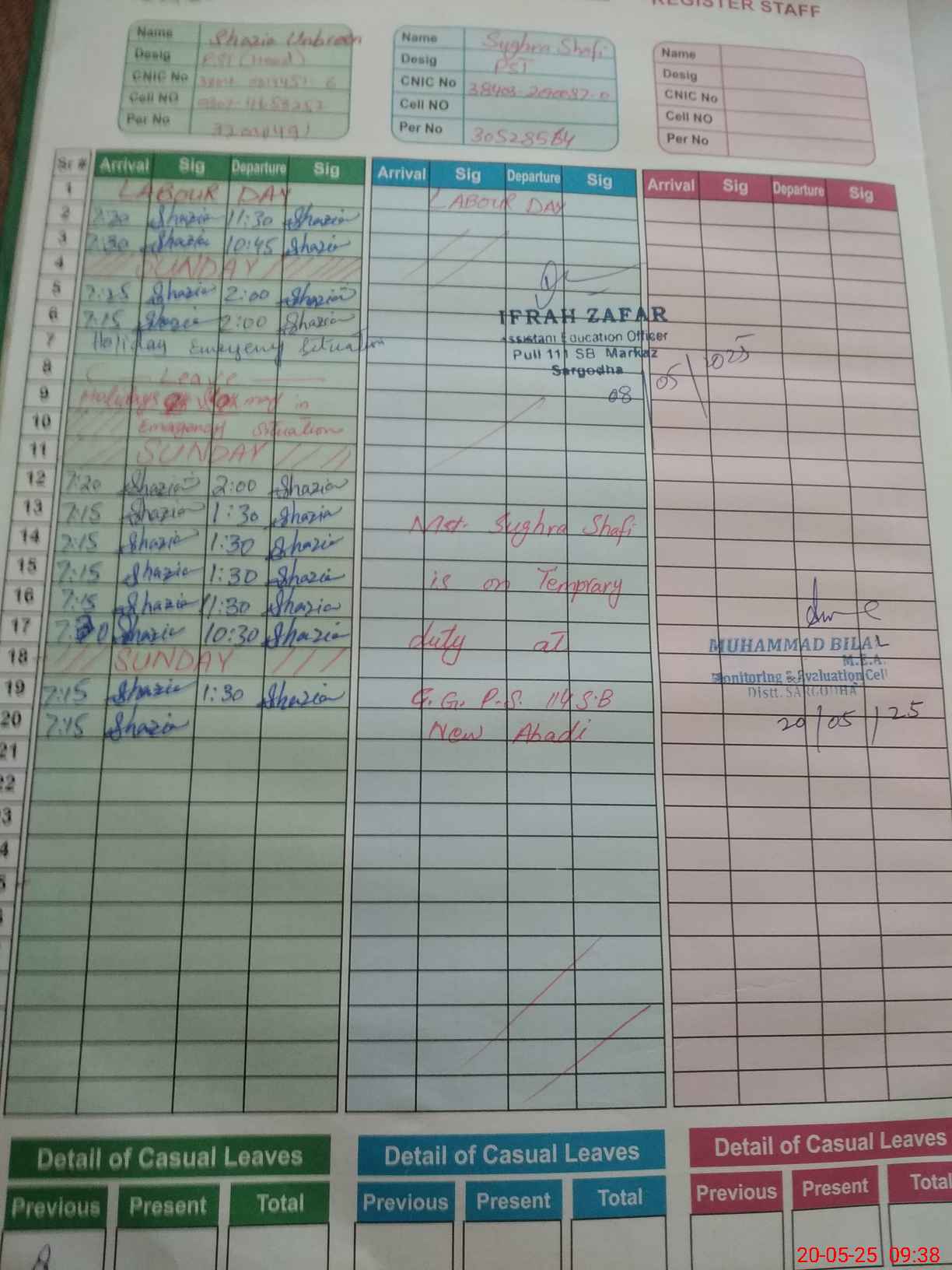 | CNIC | Full Name | Designation | R/C | Absence During Last Calender Month |