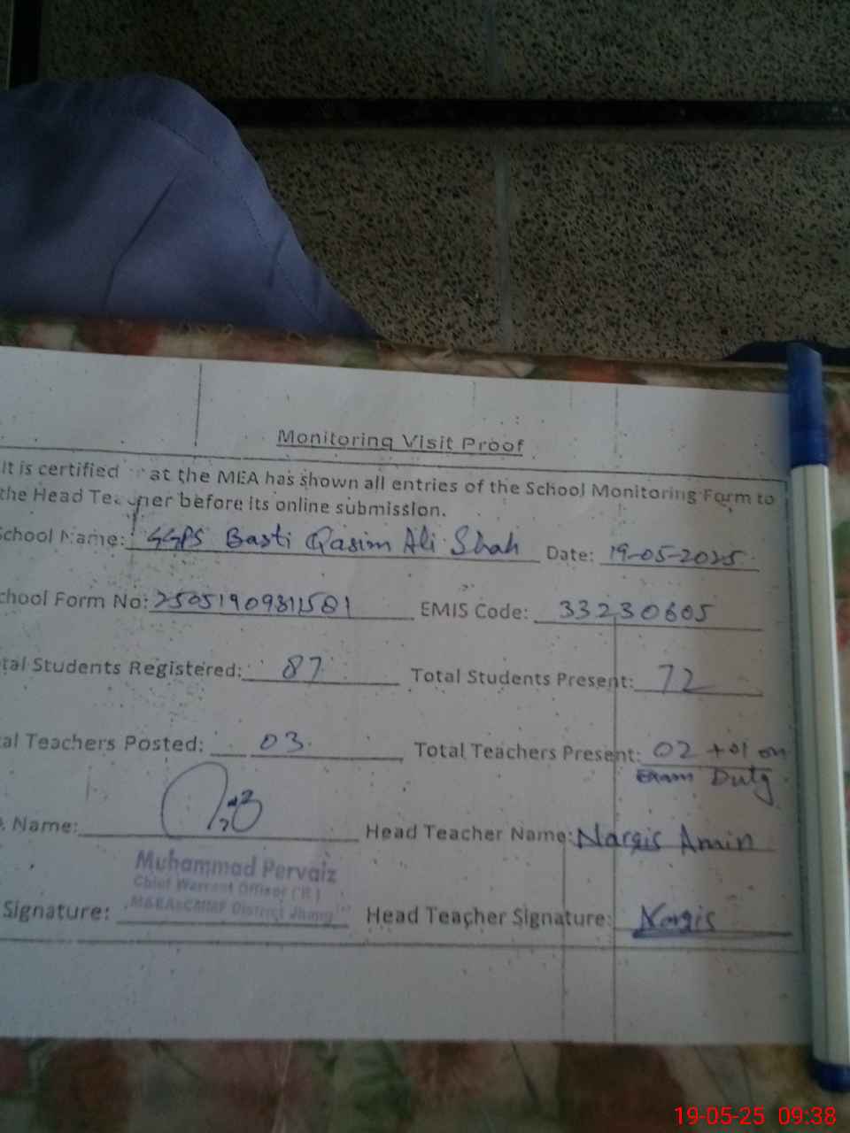 | Attendance Register | Head Teacher | MEA with School | Visit Proof |