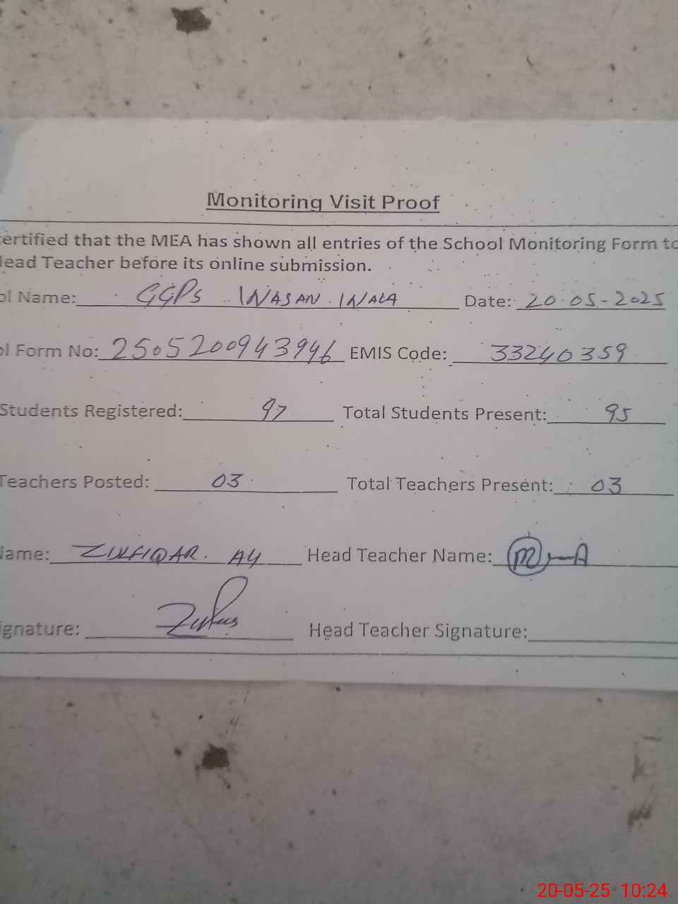 | EMIS Code: 33240359 | Name of School: GGPS WASSAN WALA | |||
