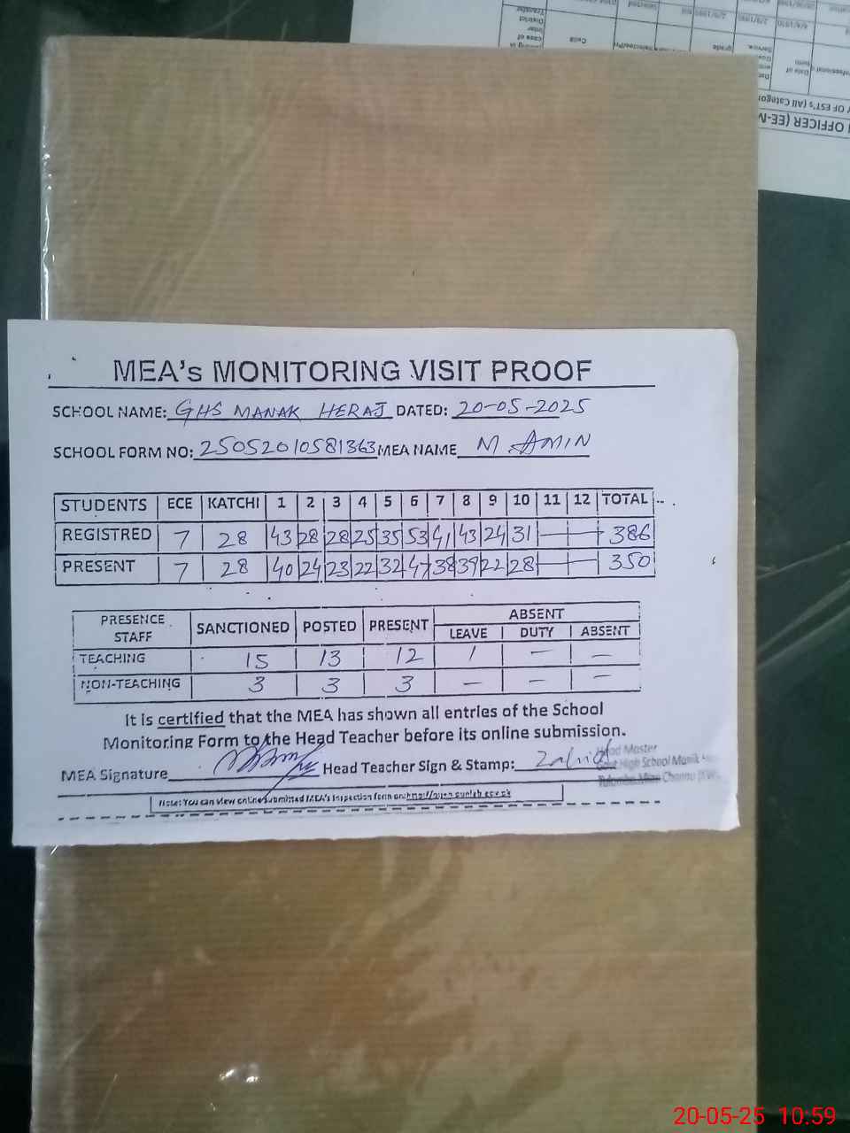 | Attendance Register | Head Teacher | MEA with School | Visit Proof |