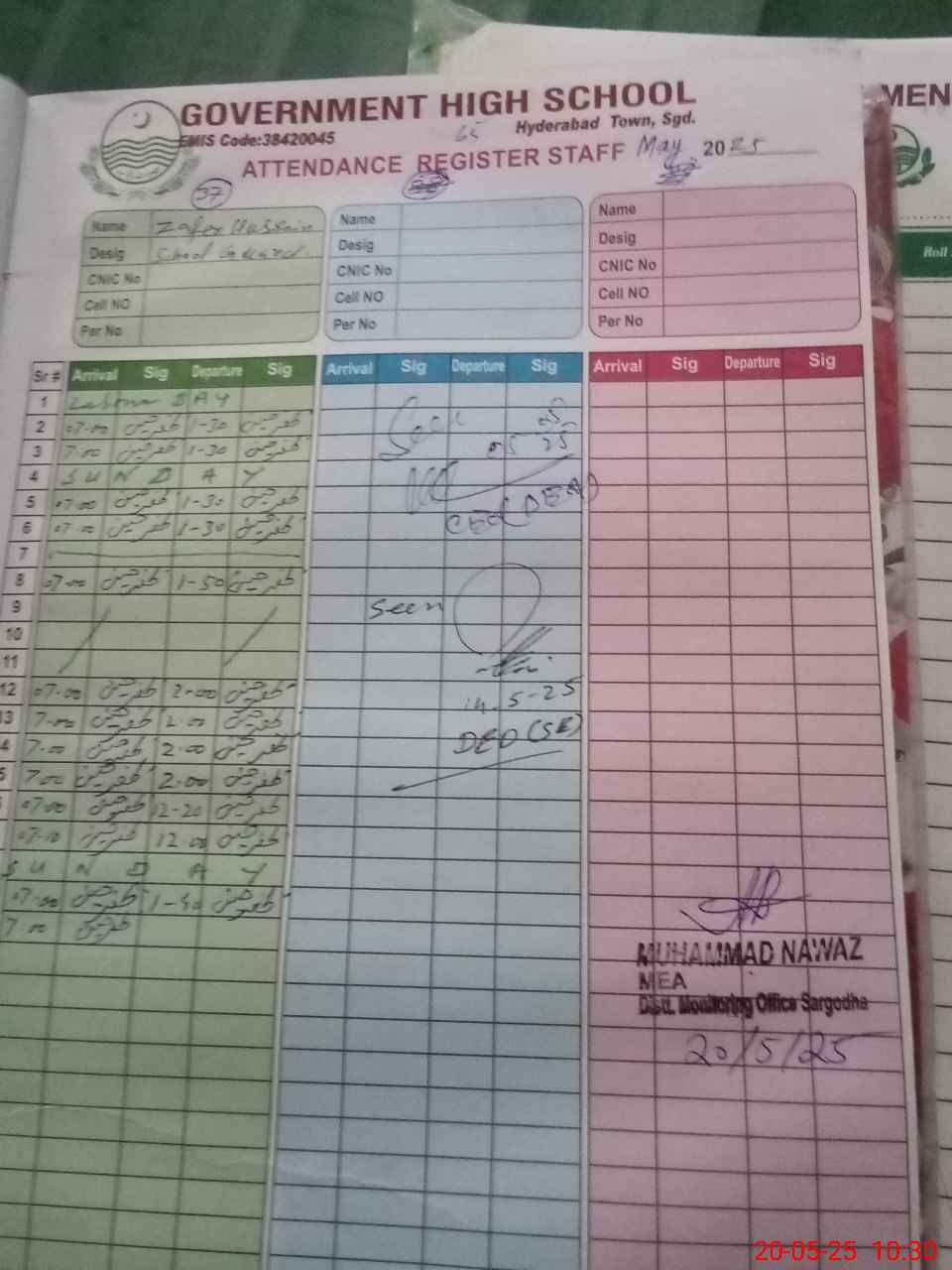 | CNIC | Full Name | Designation | R/C | Absence during last cal. month |
