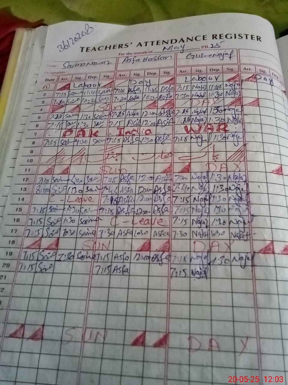 | CNIC | Full Name | Designation | R/C | Absence During Last Calender Month |