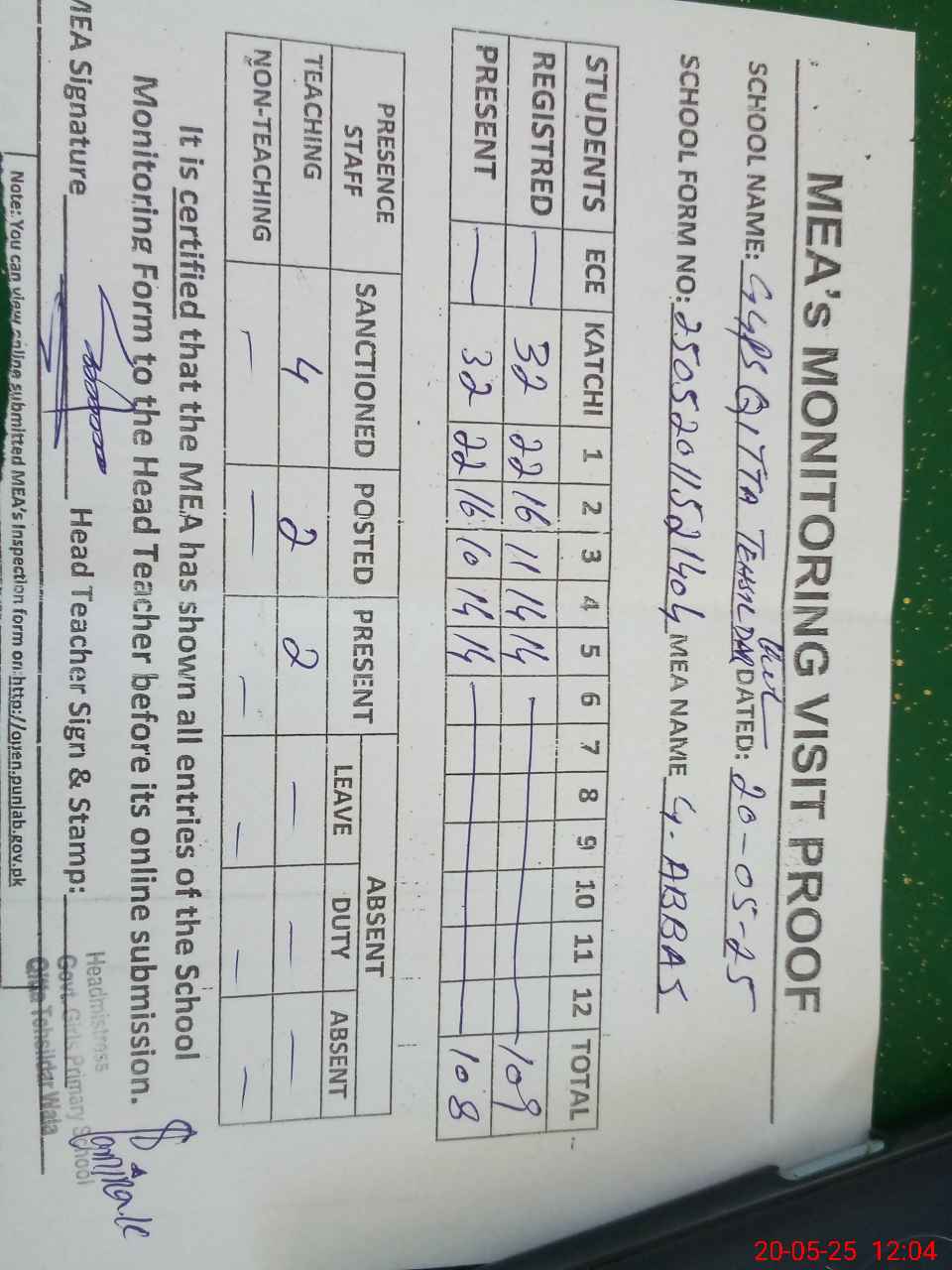 | EMIS Code: 36410454 | Name of School: GGPS QITTA TEHSIL DAR WALA, ABDUL | |||