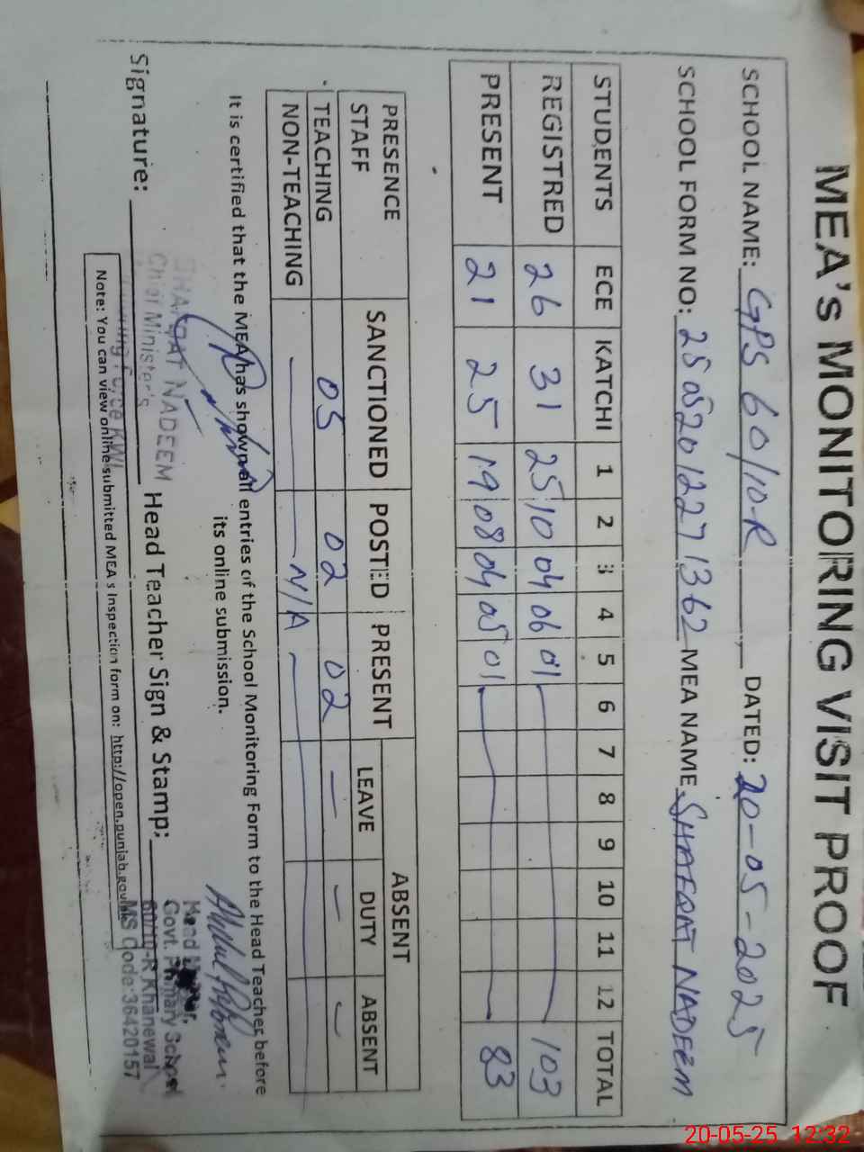 | Attendance Register | Head Teacher | MEA with School | Visit Proof |