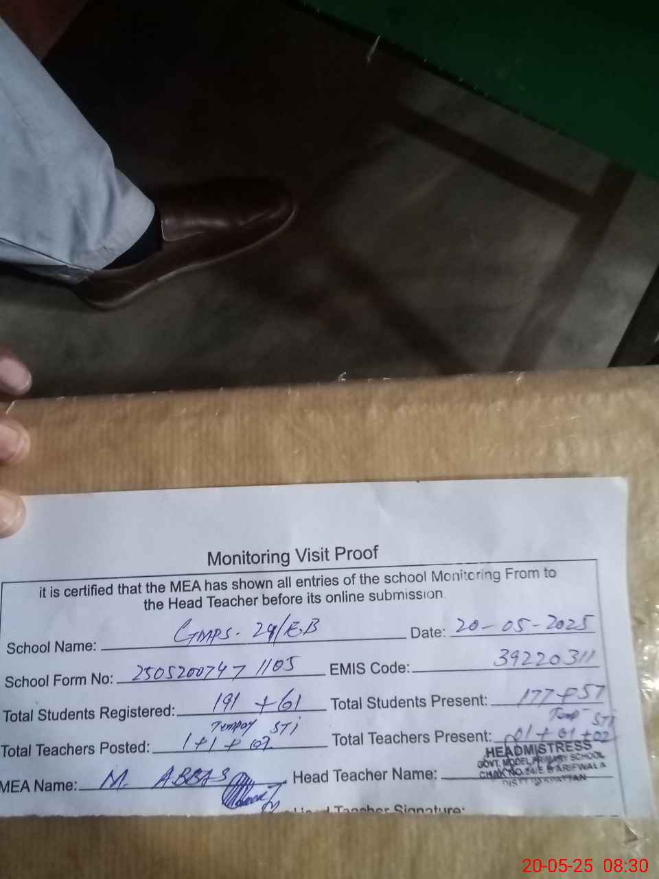| Attendance Register | Head Teacher | MEA with School | Visit Proof |
