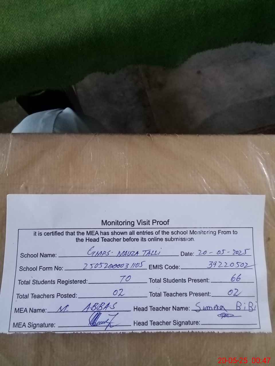 | Attendance Register | Head Teacher | MEA with School | Visit Proof |