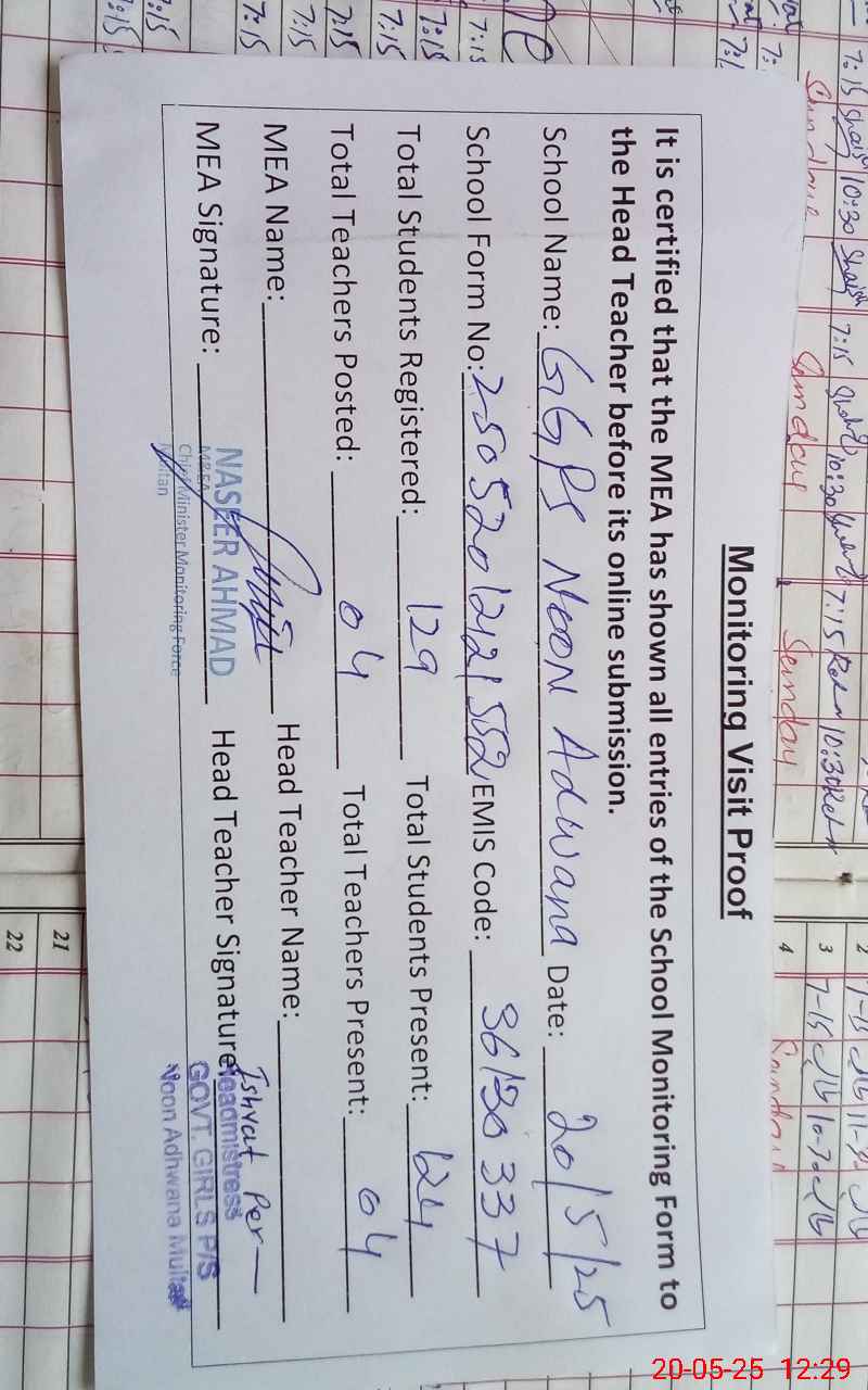 | Attendance Register | Head Teacher | MEA with School | Visit Proof |