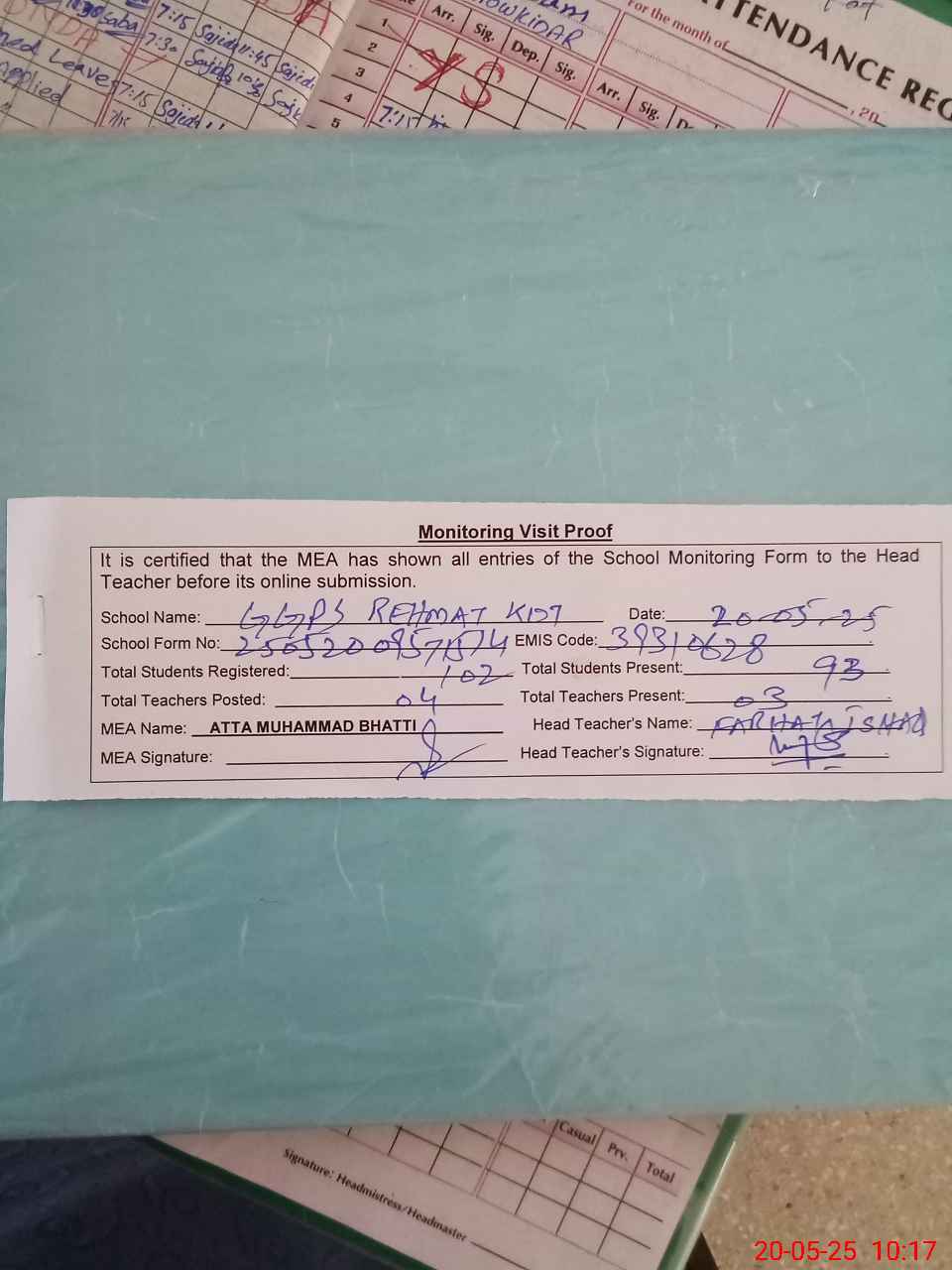 | Attendance Register | Head Teacher | MEA with School | Visit Proof |