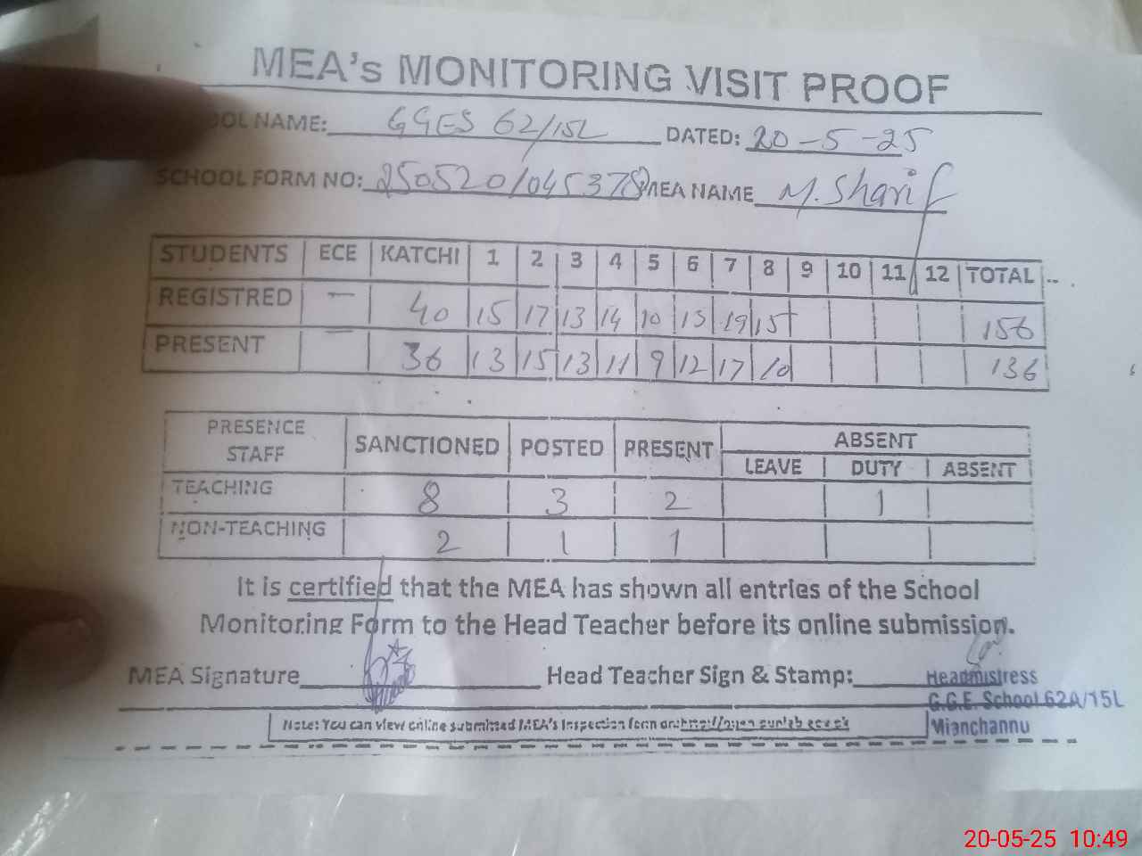 | EMIS Code: 36430280 | Name of School: GGES 62/15-L, P/O 67/15-L VIJIHIAN WALA, MIAN CHANNU | |||