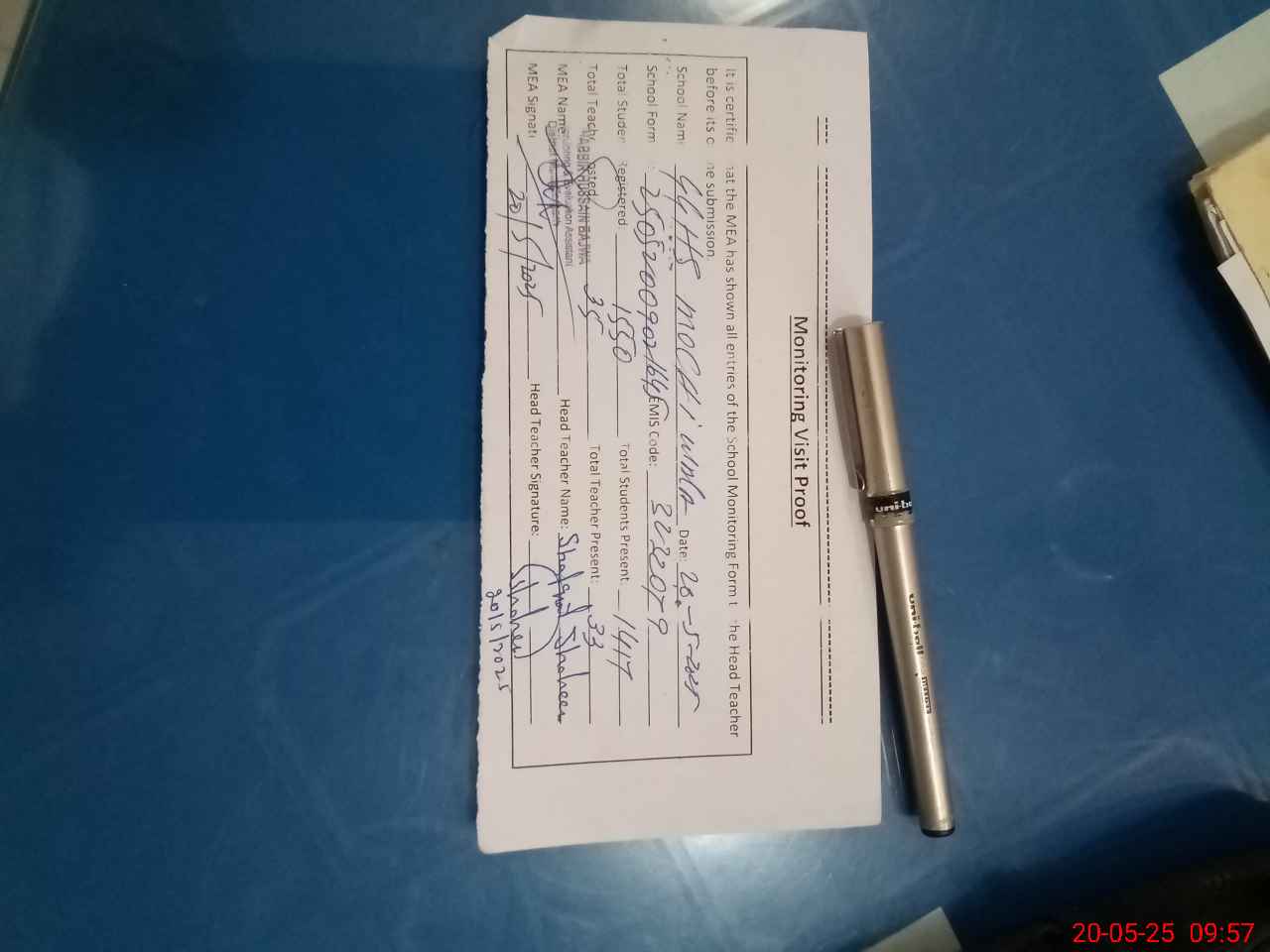 | Attendance Register | Head Teacher | MEA with School | Visit Proof |