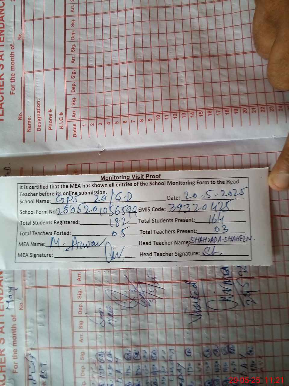 | Attendance Register | Head Teacher | MEA with School | Visit Proof |