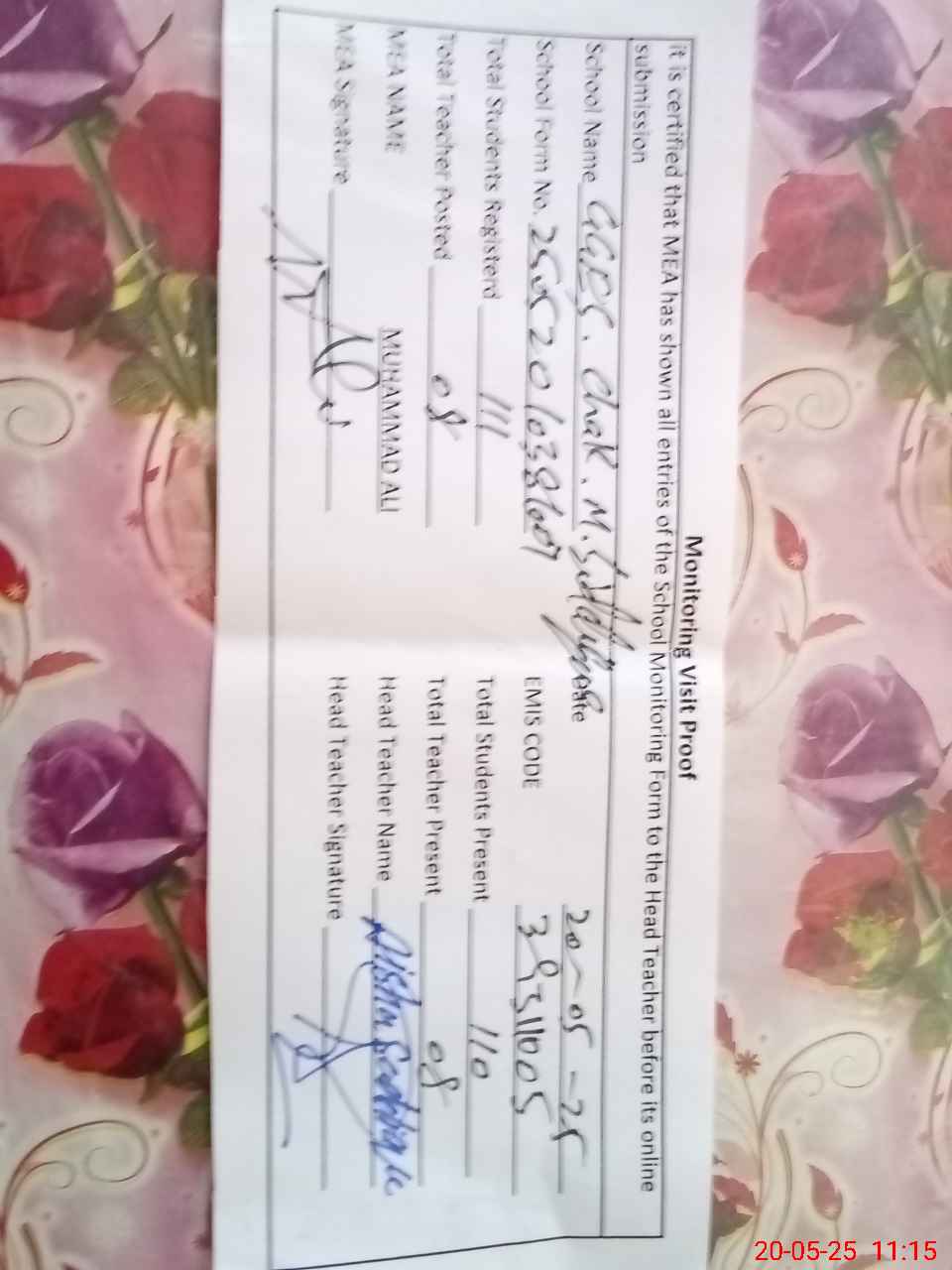 | Attendance Register | Head Teacher | MEA with School | Visit Proof |