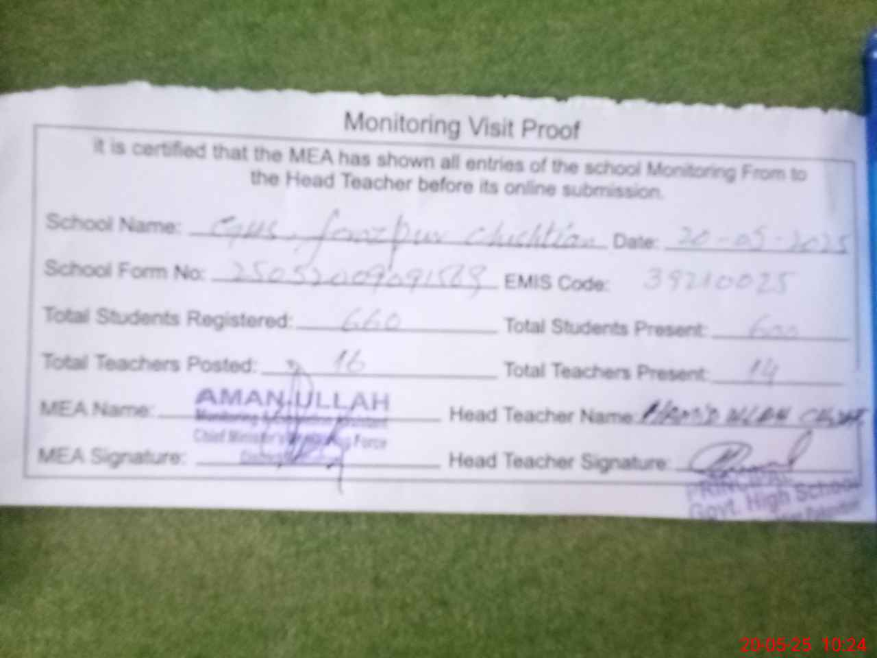 | Attendance Register | Head Teacher | MEA with School | Visit Proof |