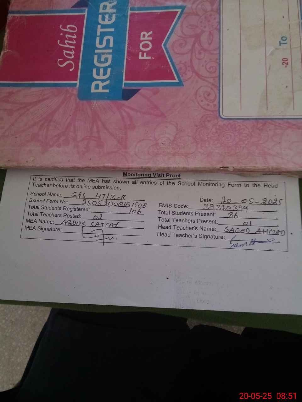 | Attendance Register | Head Teacher | MEA with School | Visit Proof |