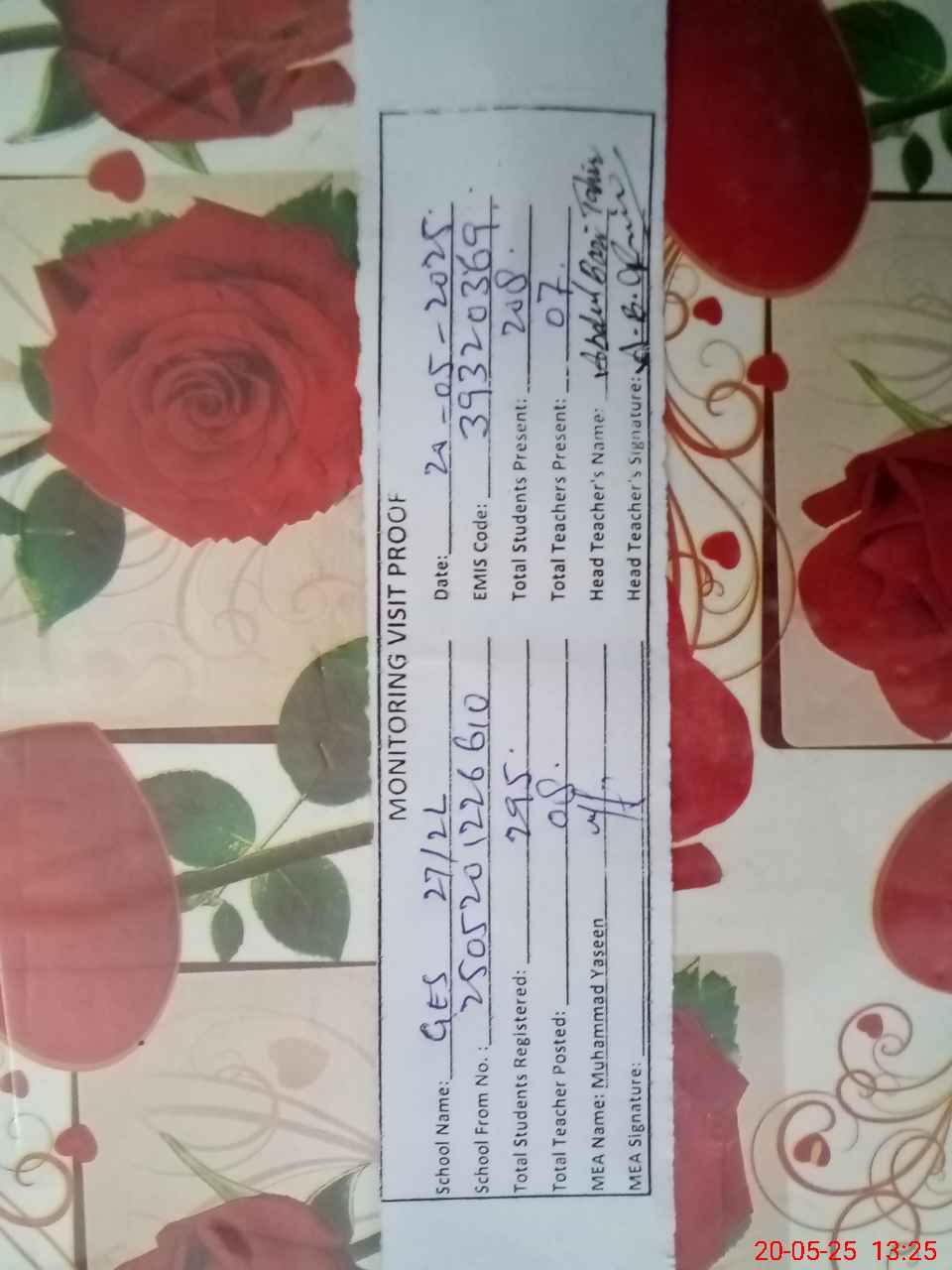 | Attendance Register | Head Teacher | MEA with School | Visit Proof |