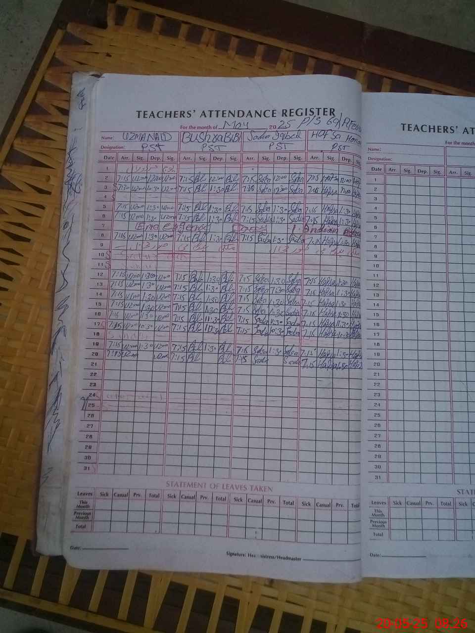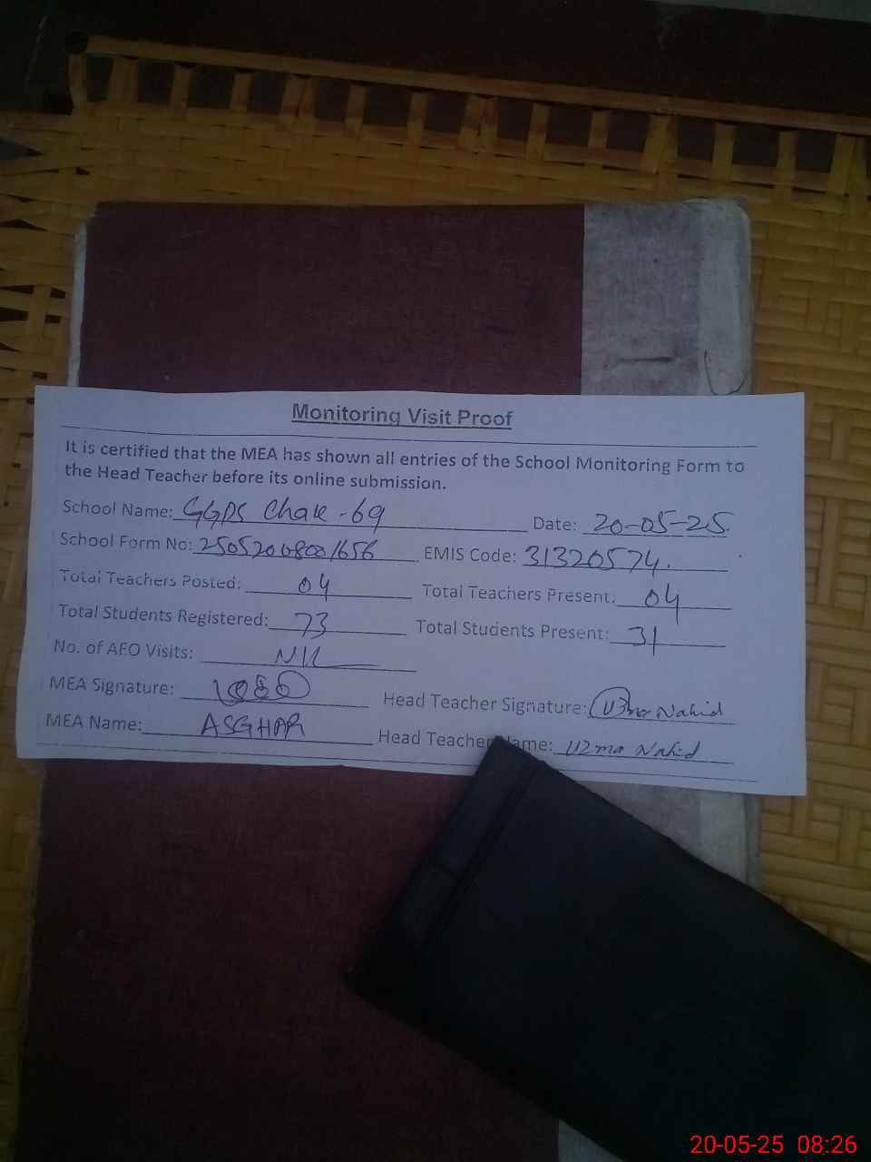 | Attendance Register | Head Teacher | MEA with School | Visit Proof |