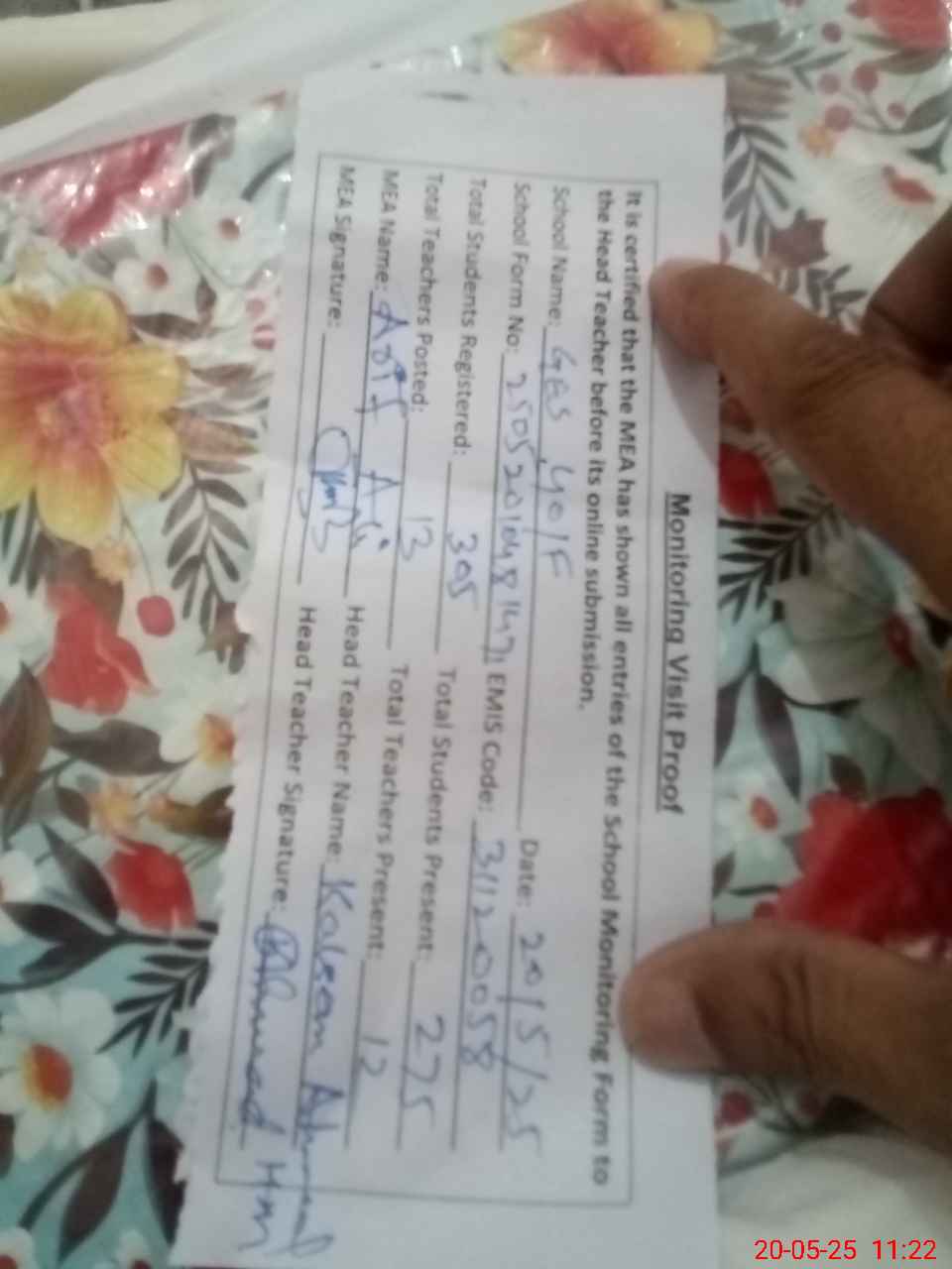 | Attendance Register | Head Teacher | MEA with School | Visit Proof |