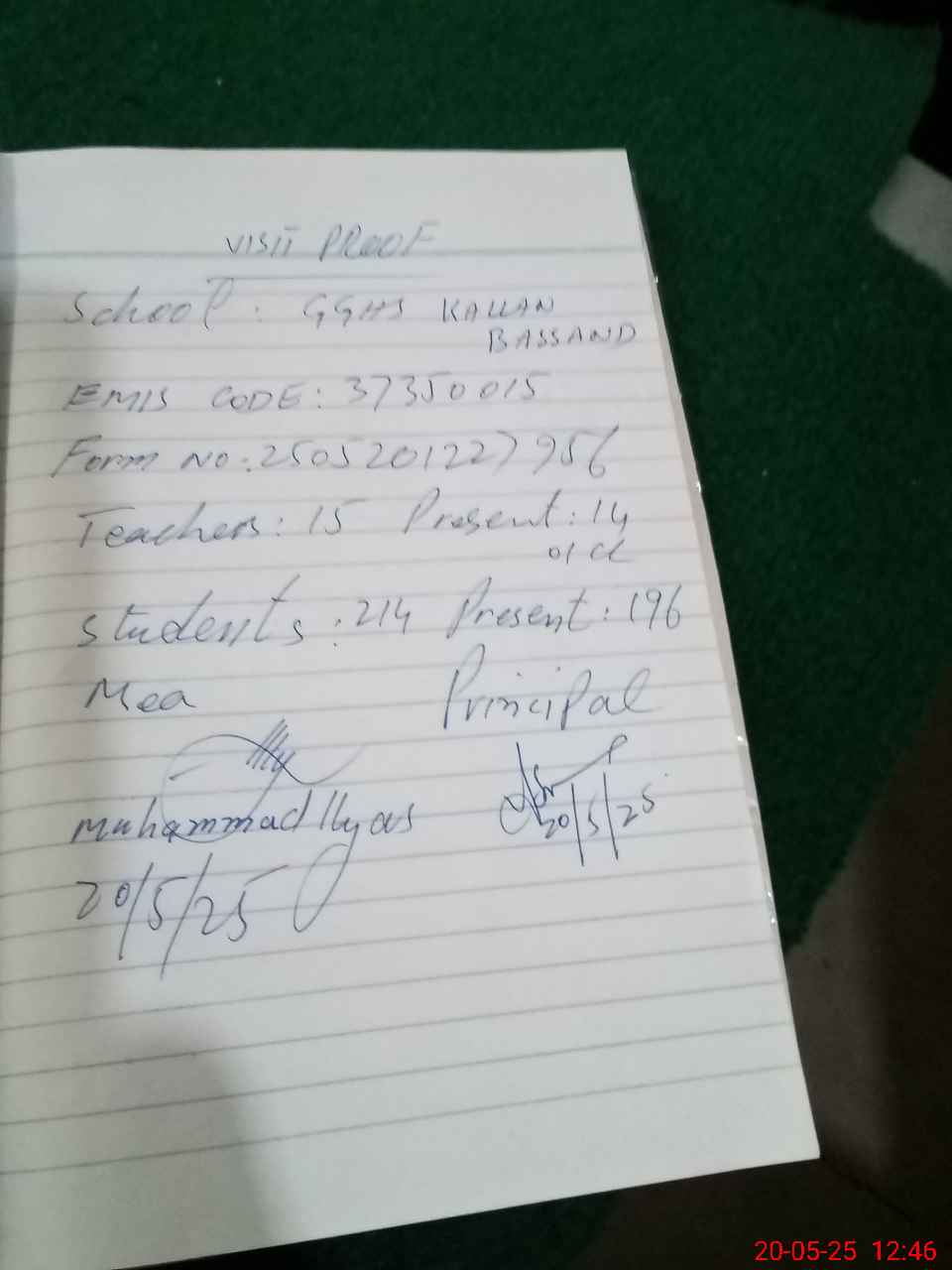 | Attendance Register | Head Teacher | MEA with School | Visit Proof |