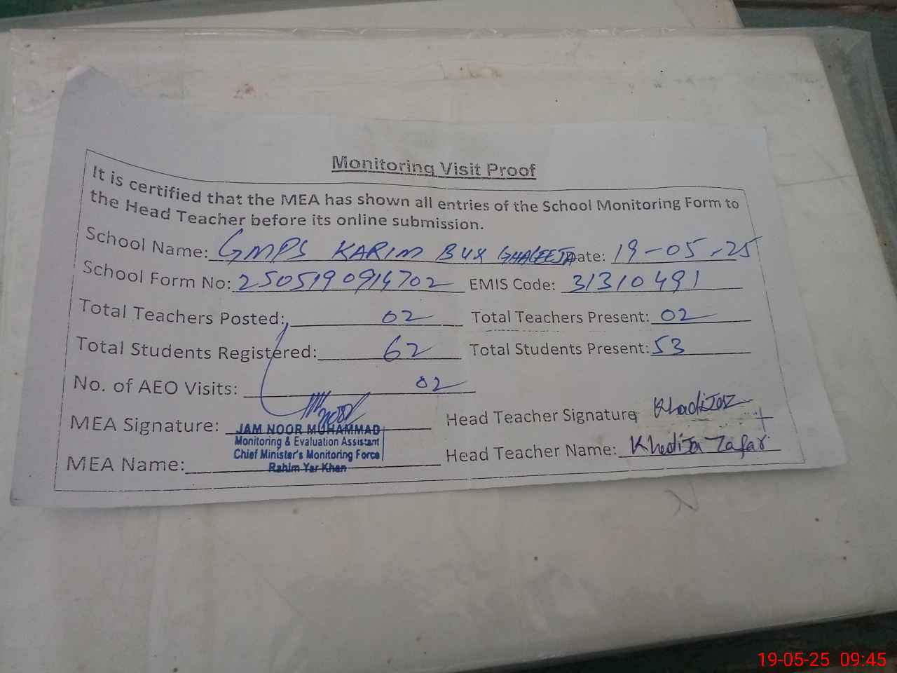 | Attendance Register | Head Teacher | MEA with School | Visit Proof |
