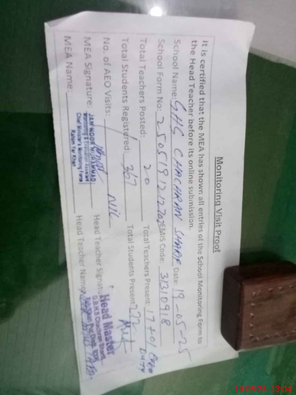 | Attendance Register | Head Teacher | MEA with School | Visit Proof |