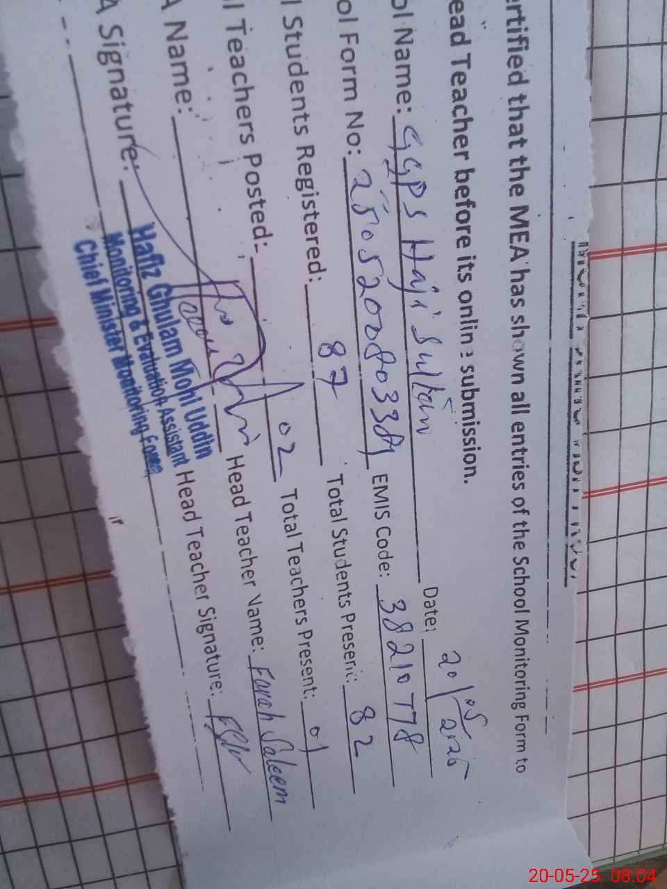 | EMIS Code: 38210778 | Name of School: GGPS HAJI SULTAN MEHMOOD PALUWAN | |||
