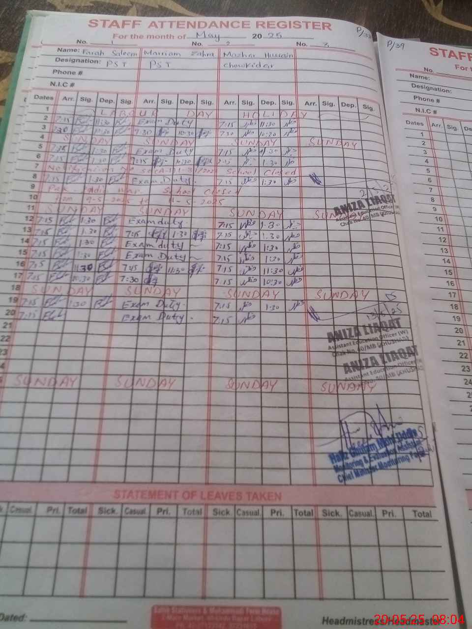 | 38**** | Ma**** Za**** | PST | Regular | 0 | 0 | 0 | 0 | 0 | 0 | 0 | 0 | 0 | Exam Duty |
