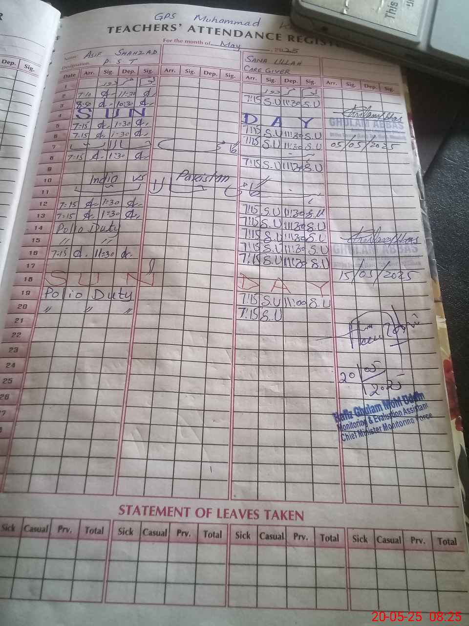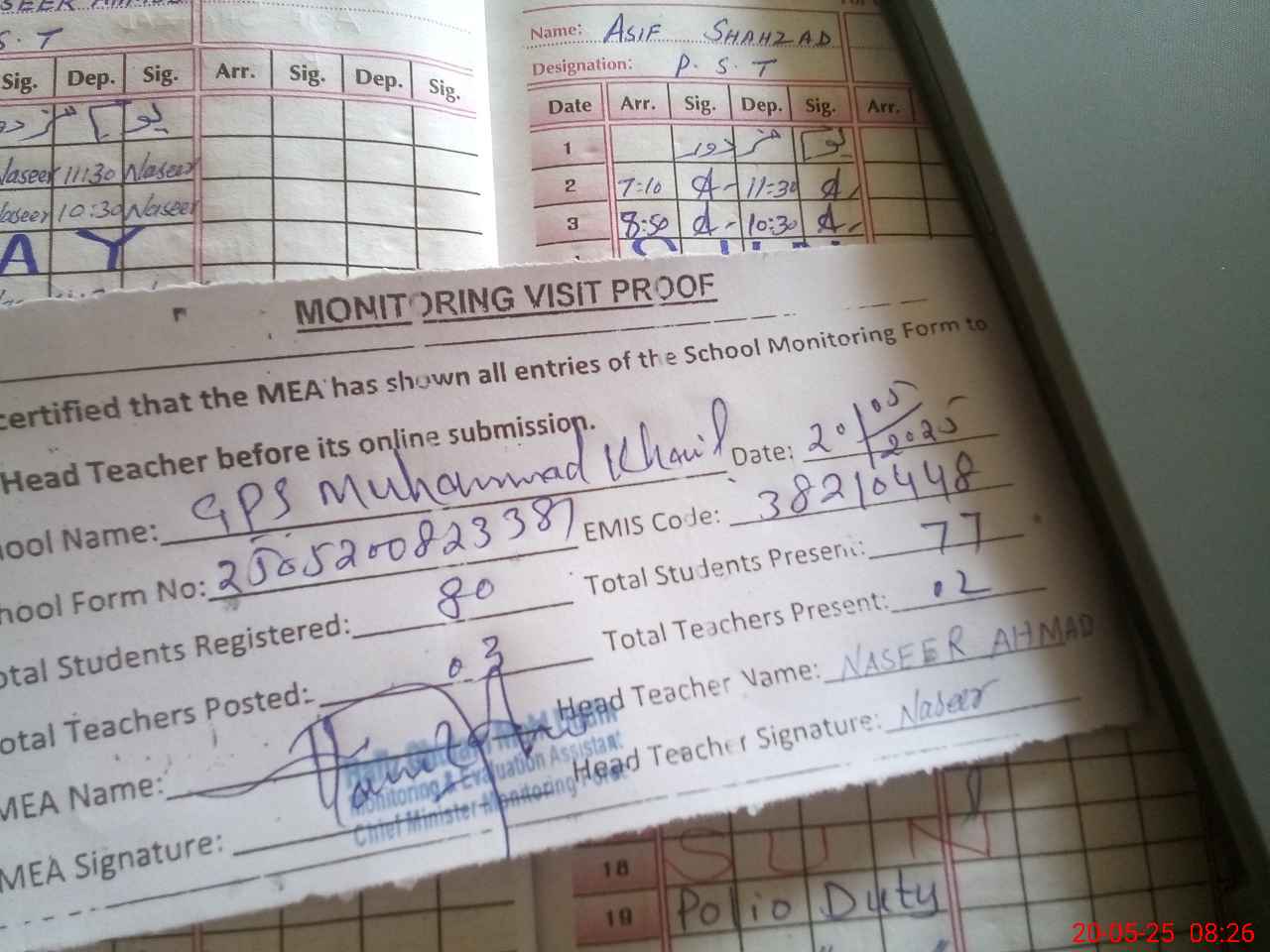 | Attendance Register | Head Teacher | MEA with School | Visit Proof |