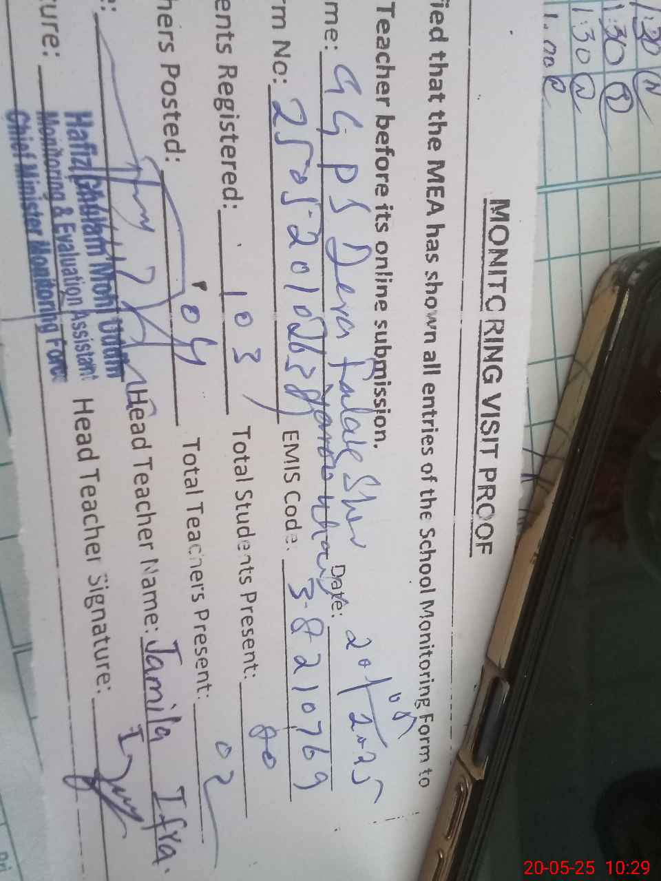 | Attendance Register | Head Teacher | MEA with School | Visit Proof |