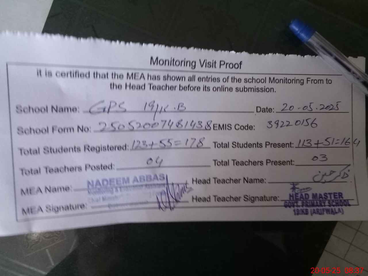 | EMIS Code: 39220156 | Name of School: GPS CHAK NO. 19 KB | |||