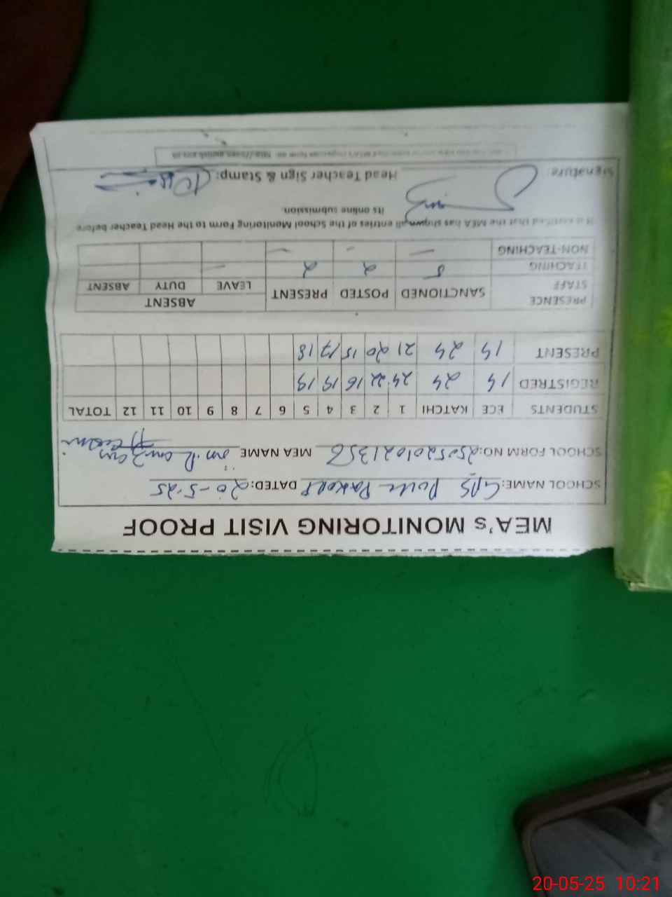 | Attendance Register | Head Teacher | MEA with School | Visit Proof |