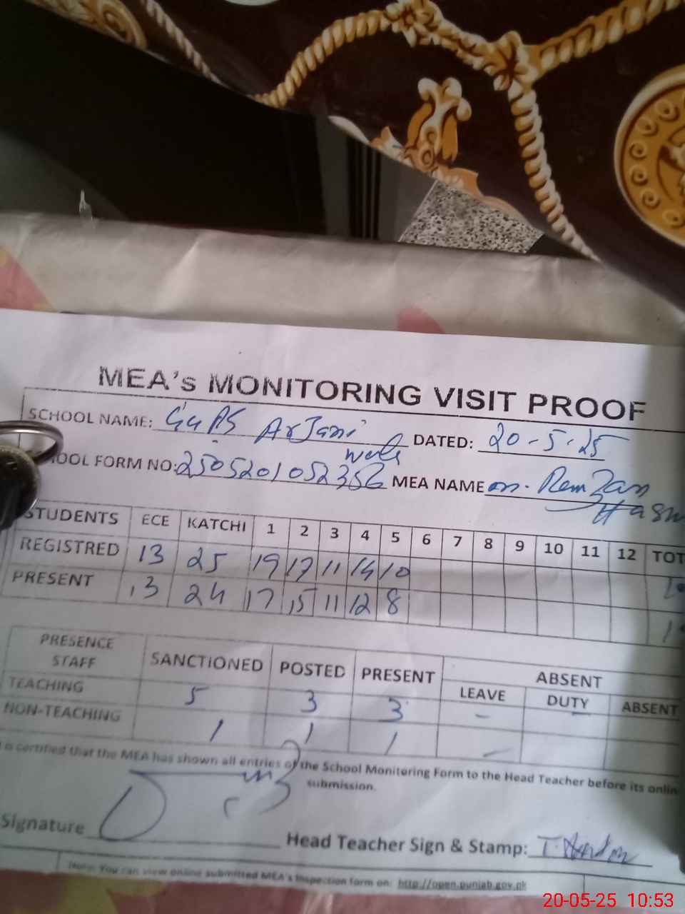 | Attendance Register | Head Teacher | MEA with School | Visit Proof |