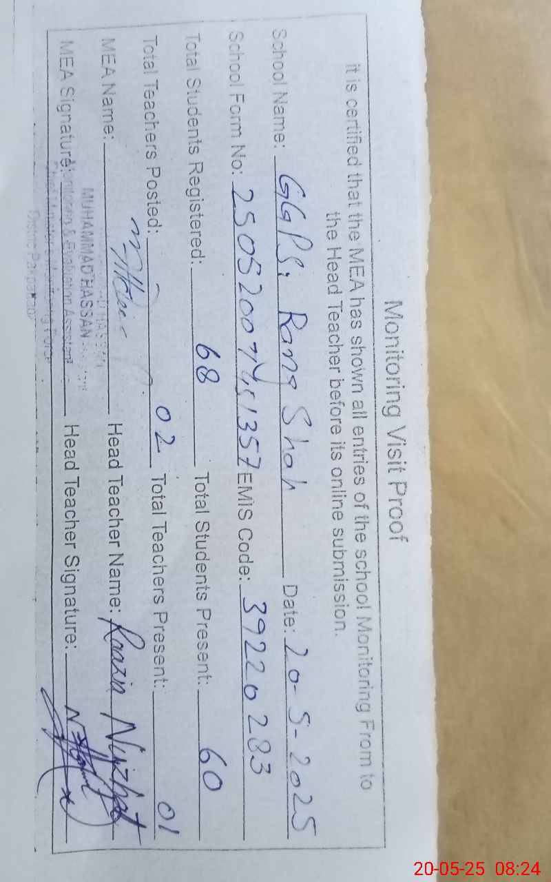 | EMIS Code: 39220283 | Name of School: GGPS RANG SHAH | |||