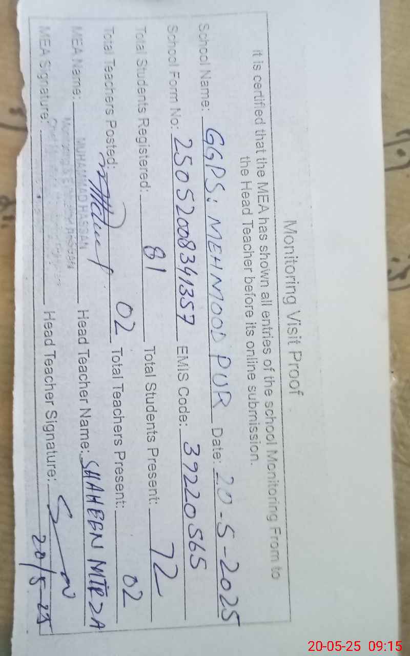 | EMIS Code: 39220565 | Name of School: GGPS MEHMOOD PUR | |||