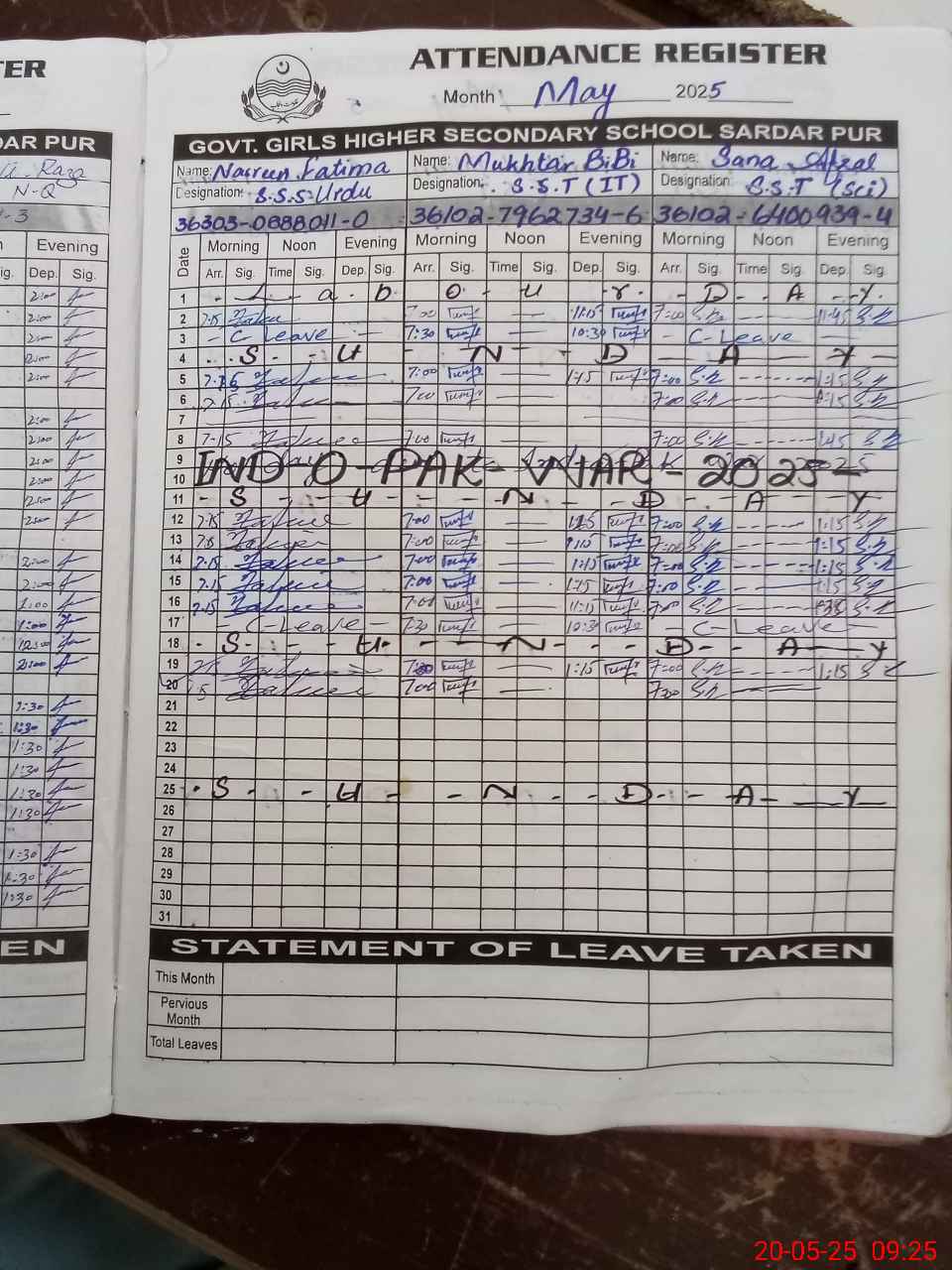 | 36**** | Sa**** | NQ | Regular | 2 | 0 | 0 | 0 | 0 | 0 | 0 | 0 | 2 | Absent (Un-Authorized) |