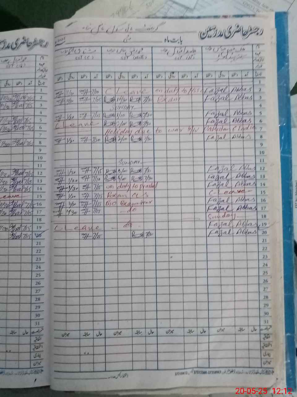 | CNIC | Full Name | Designation | R/C | Absence During Last Calender Month |